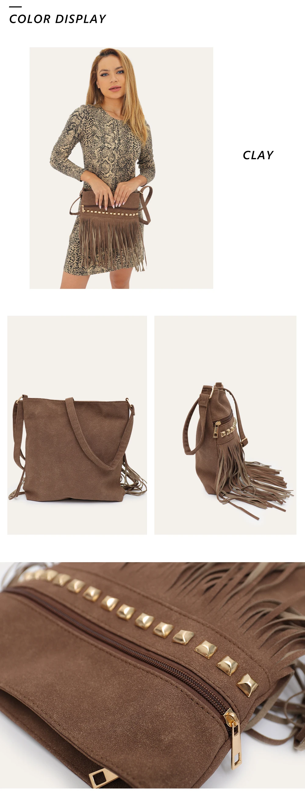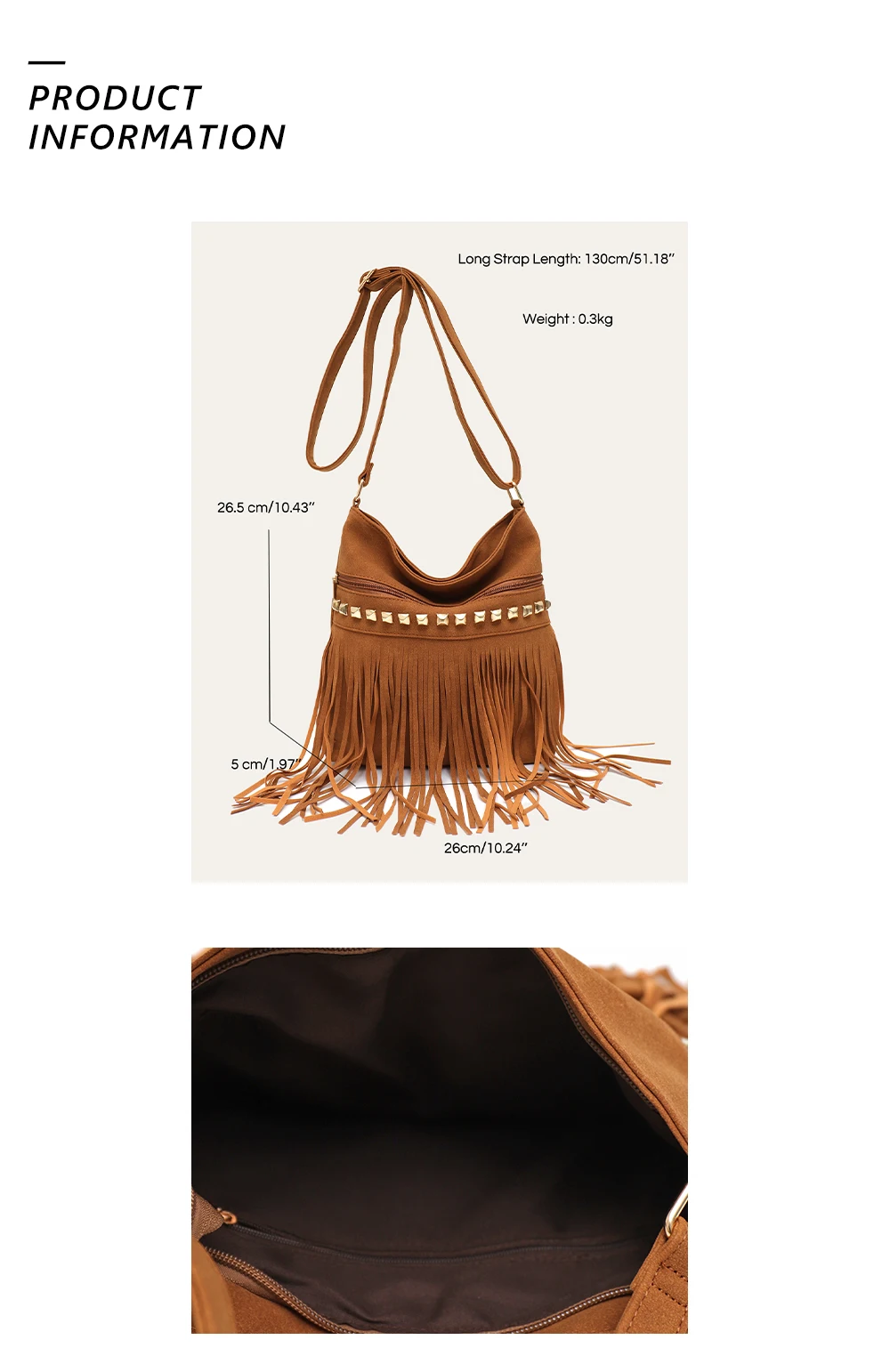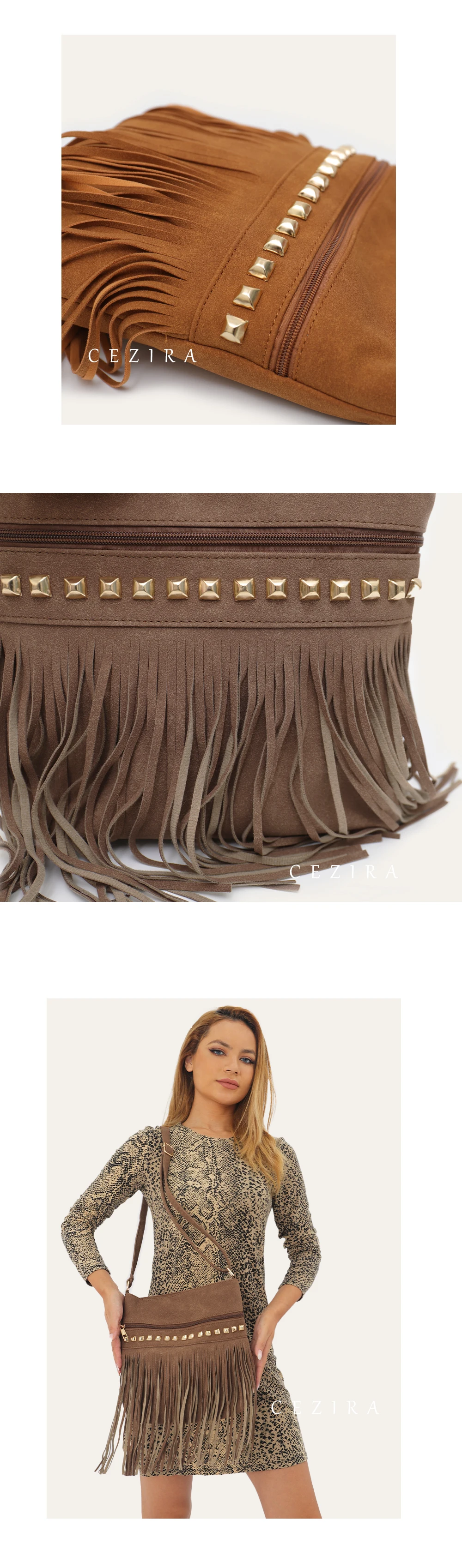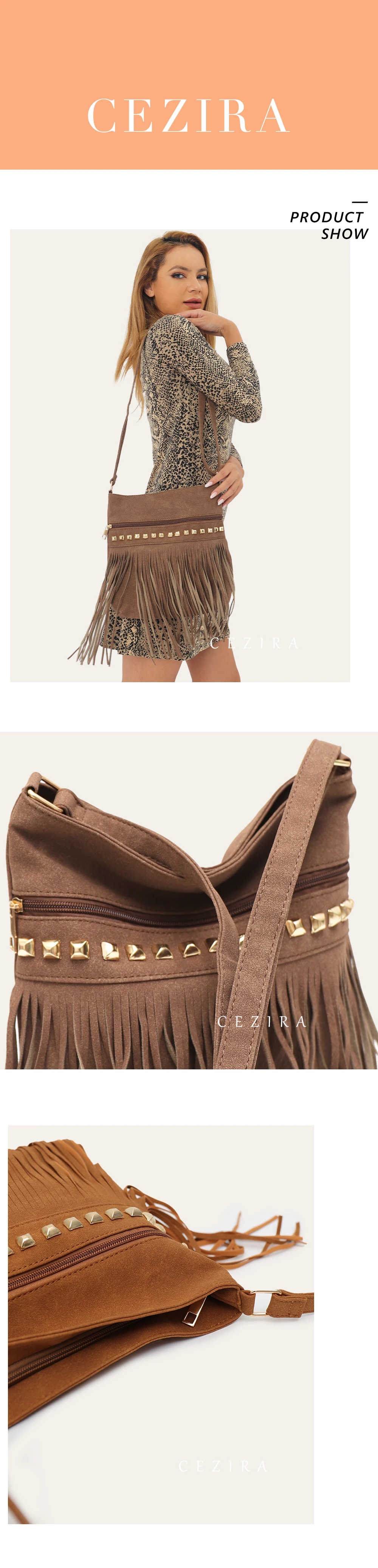CEZIRA Faux Suede PU Leather Shoulder Bag Women Bohemia Style Tassel Fringe Handbags Rivets Decor Cross body Zipper Purse Hippie