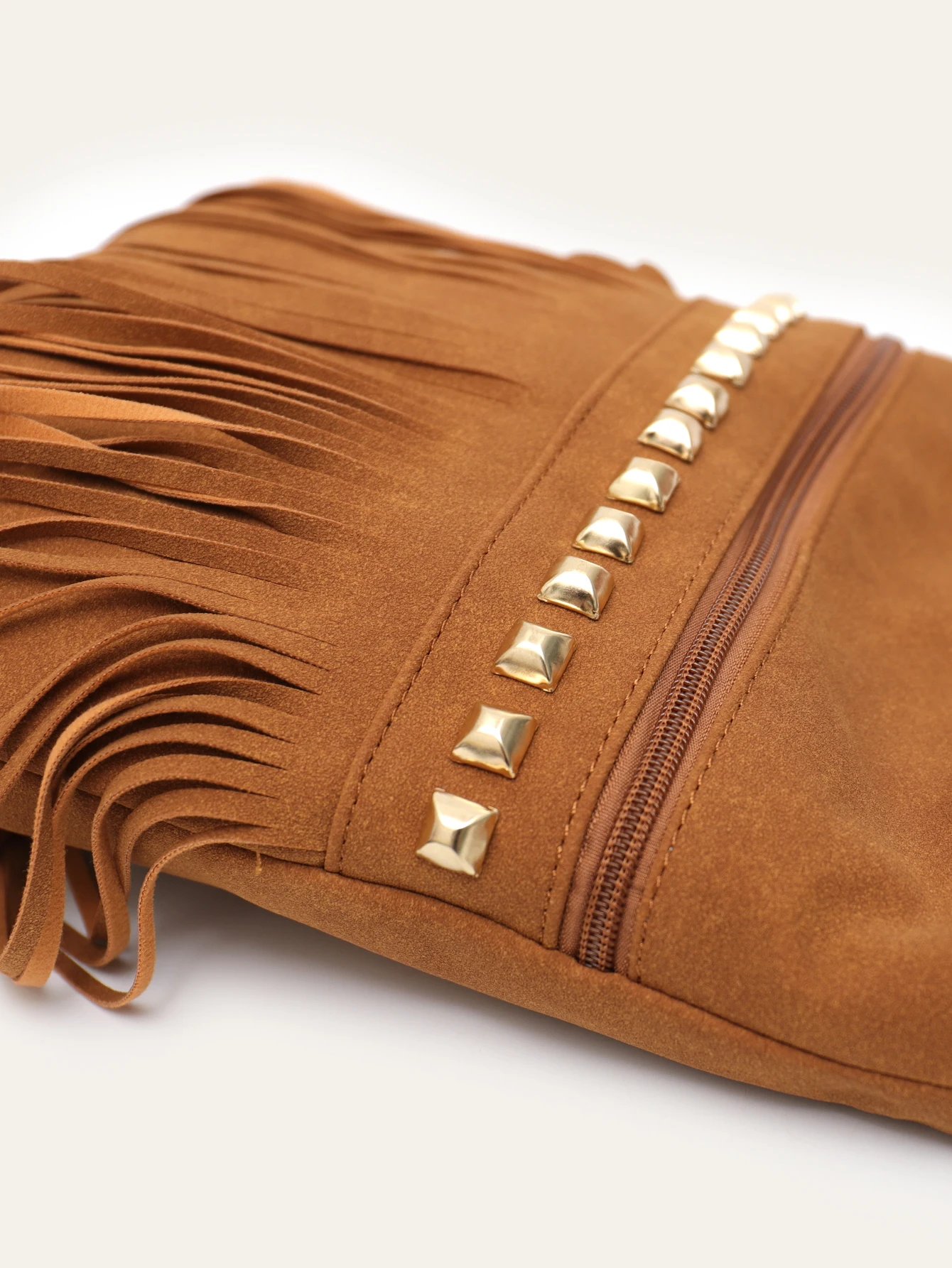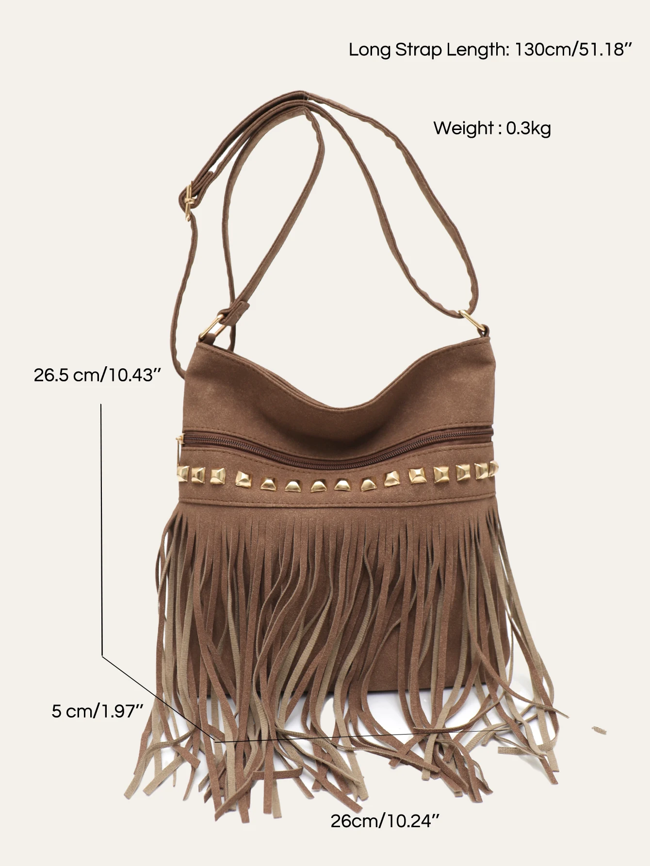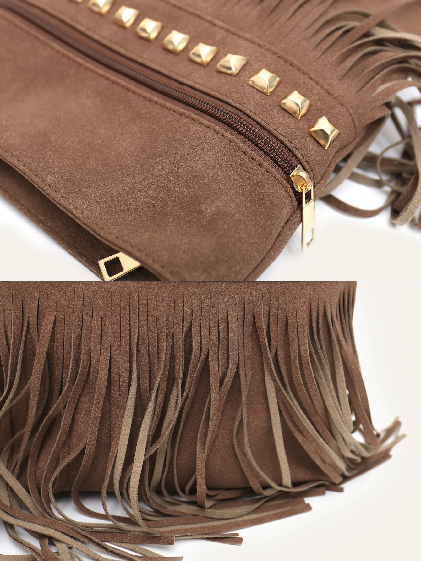 CEZIRA Faux Suede PU Leather Shoulder Bag Women Bohemia Style Tassel Fringe Handbags Rivets Decor Cross body Zipper Purse Hippie