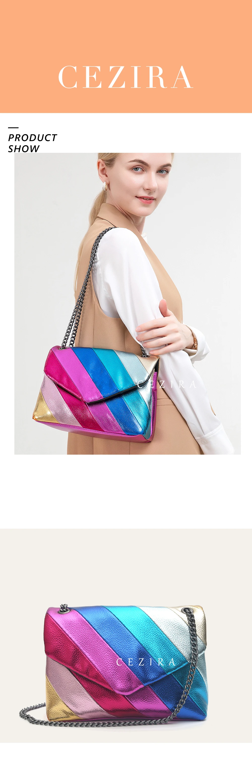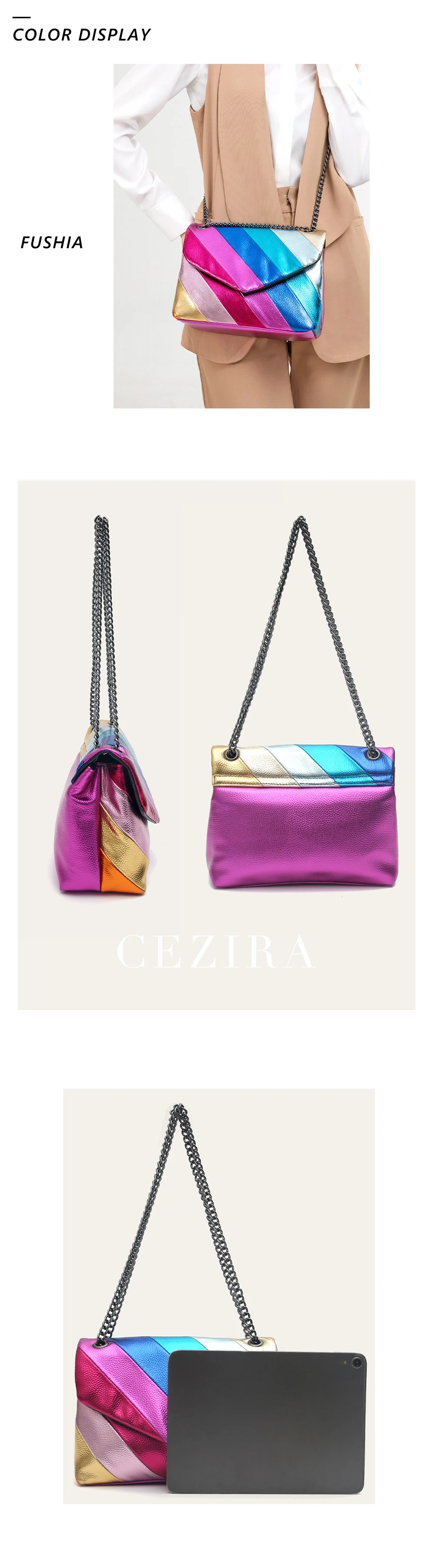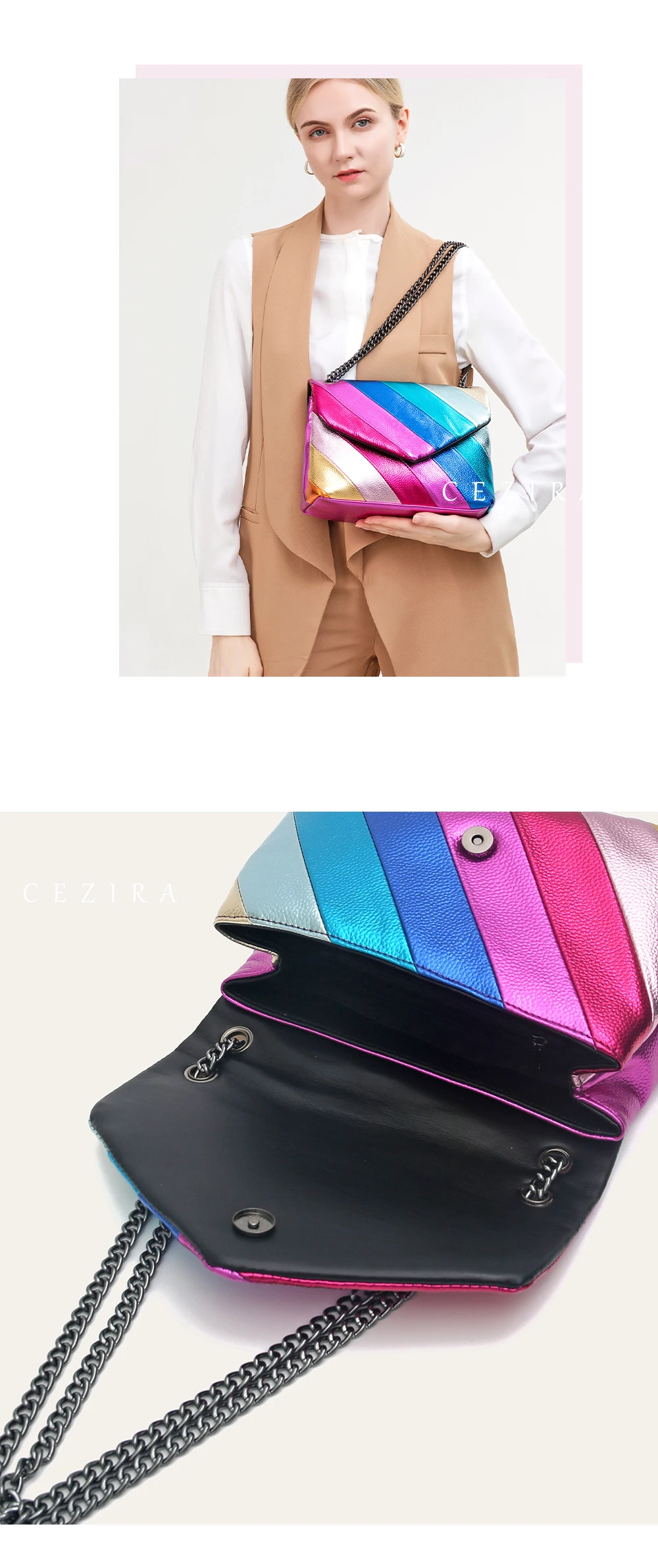 CEZIRA Luxury Metallic PU Leather Flap Shoulder Bag for Women Colorful Stripes Patchwork Chain Cross body Handbag Daily Casual