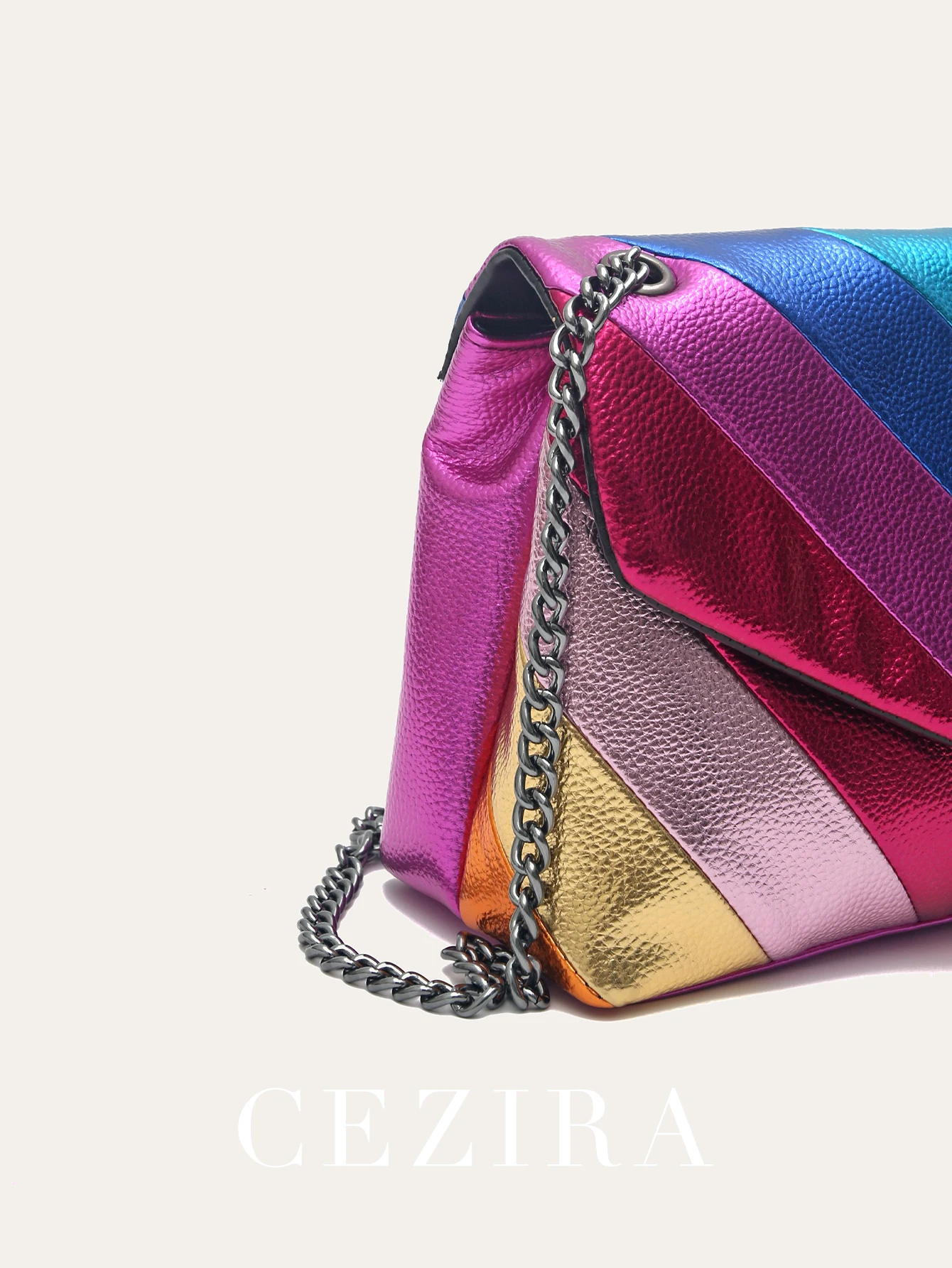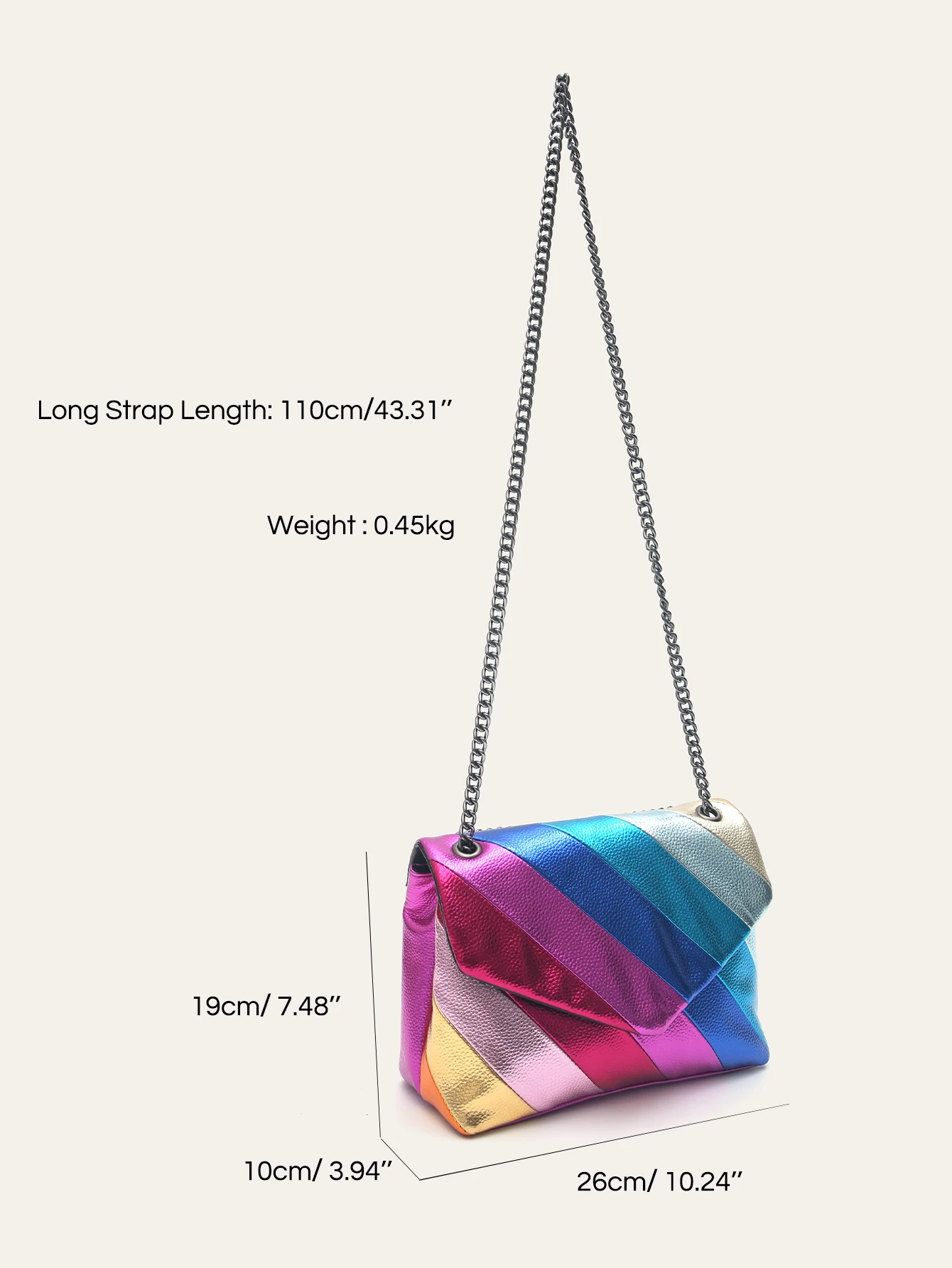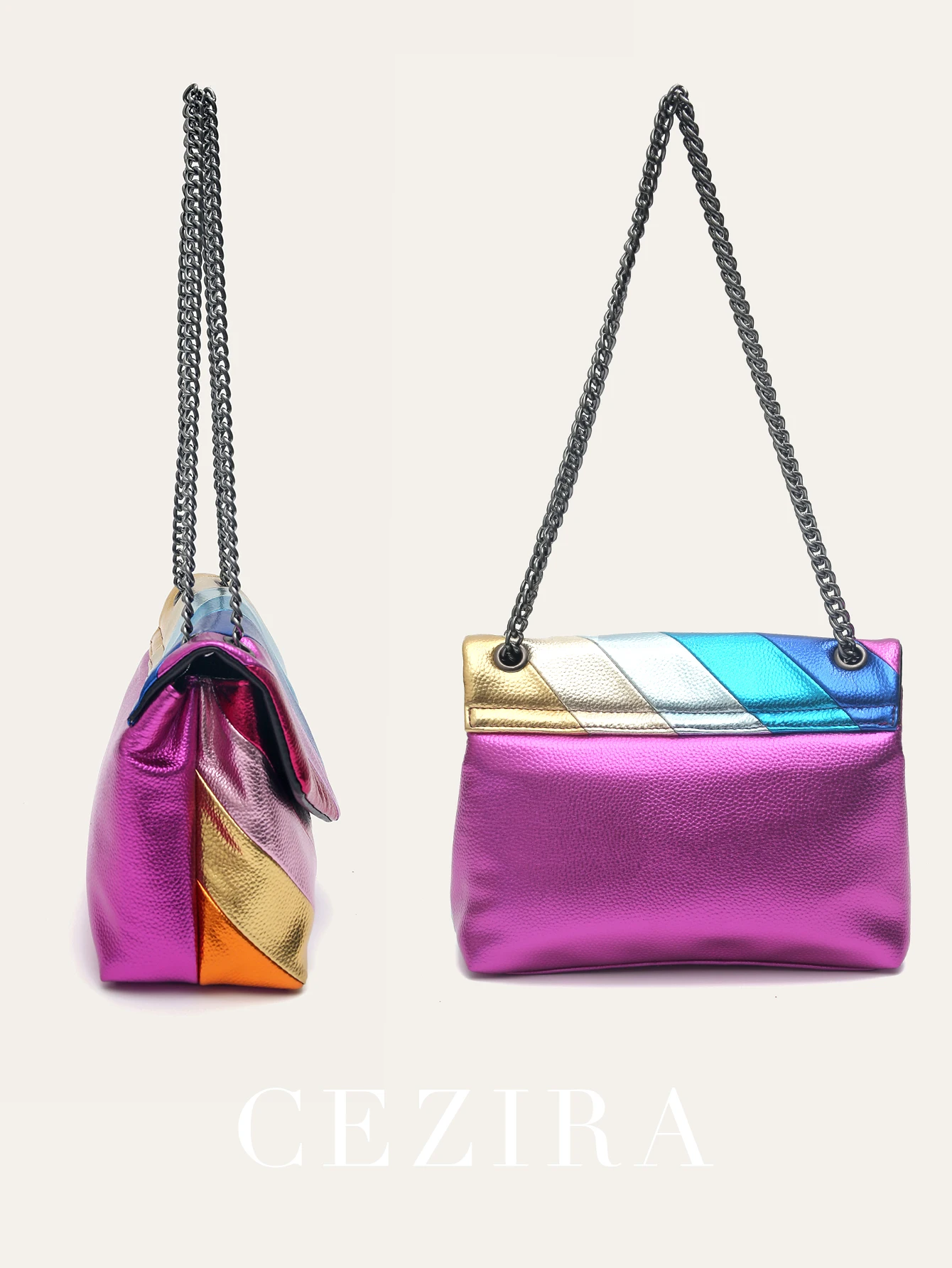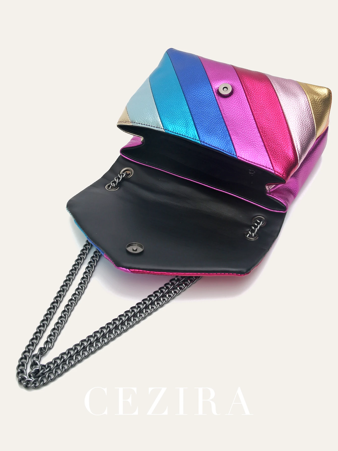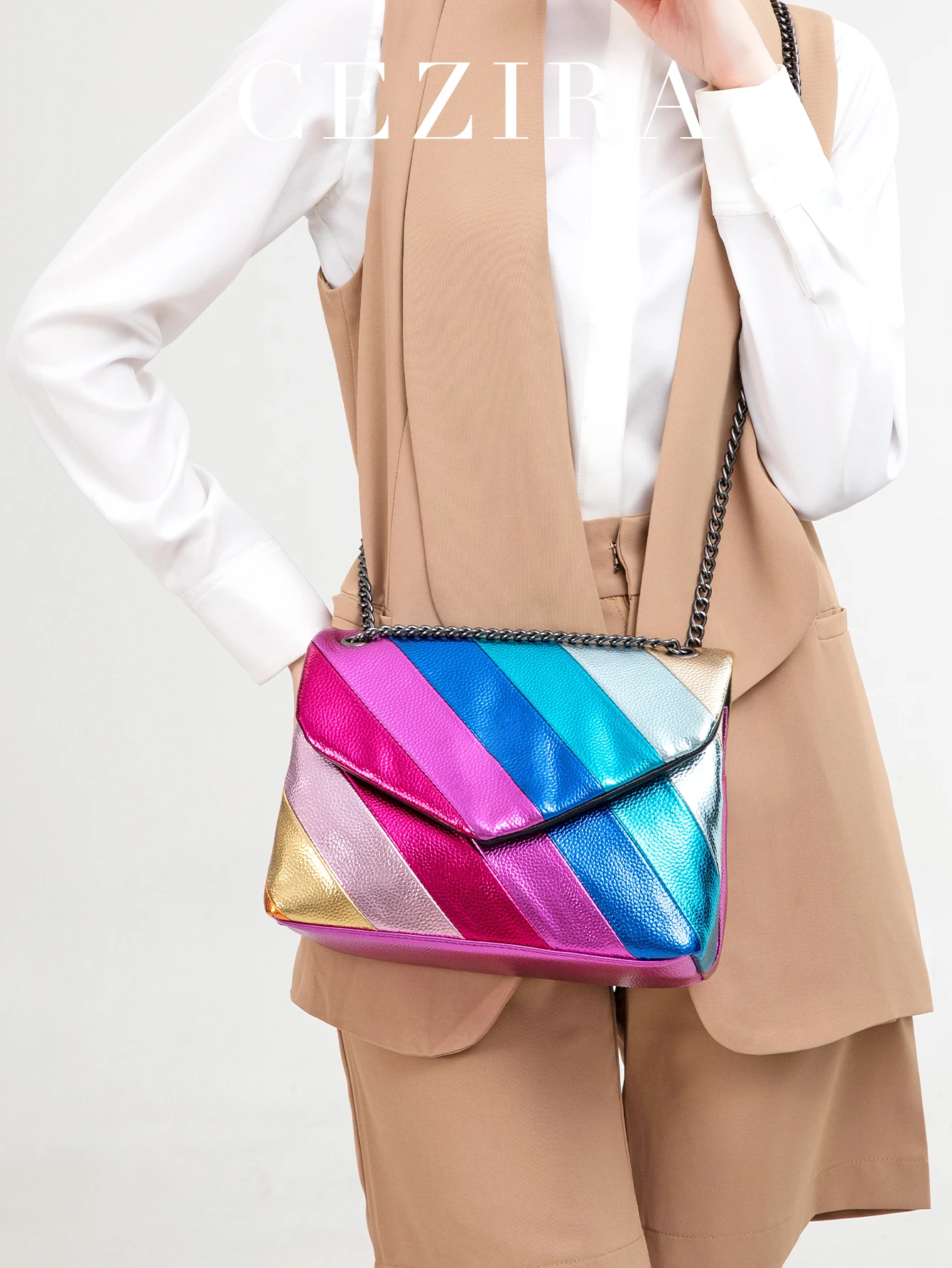 CEZIRA Luxury Metallic PU Leather Flap Shoulder Bag for Women Colorful Stripes Patchwork Chain Cross body Handbag Daily Casual
