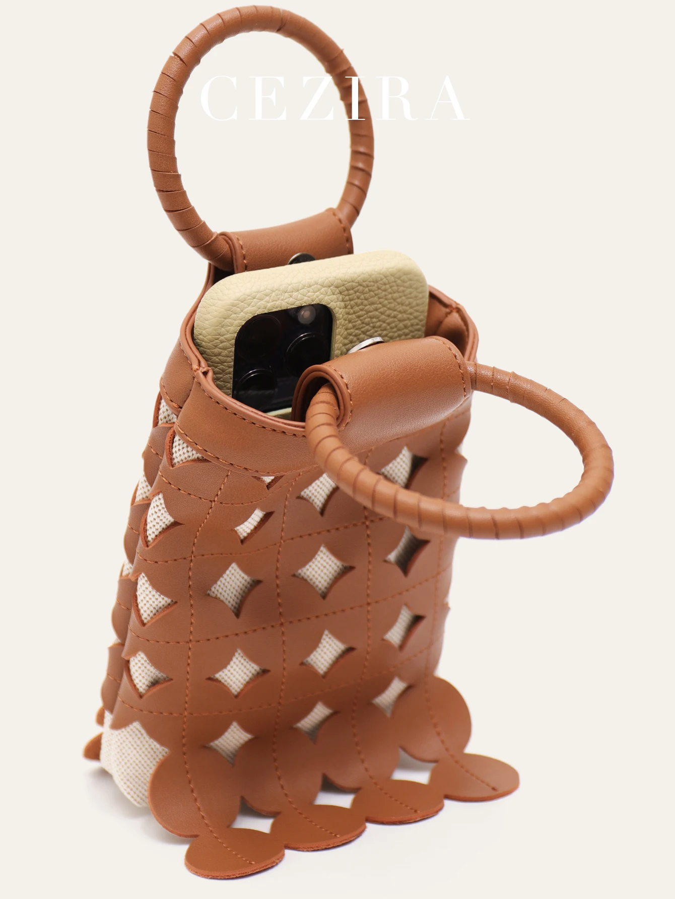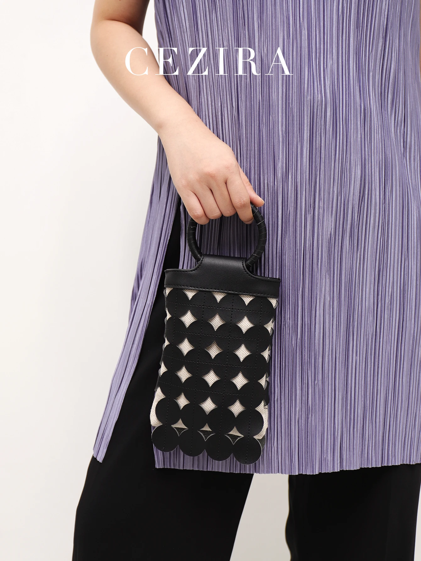 CEZIRA Niche Brand MIni Phone Purses Women Fashion Hollow Out PU Leather Handbags Round Handles Portable Crossbody Shoulder Bags