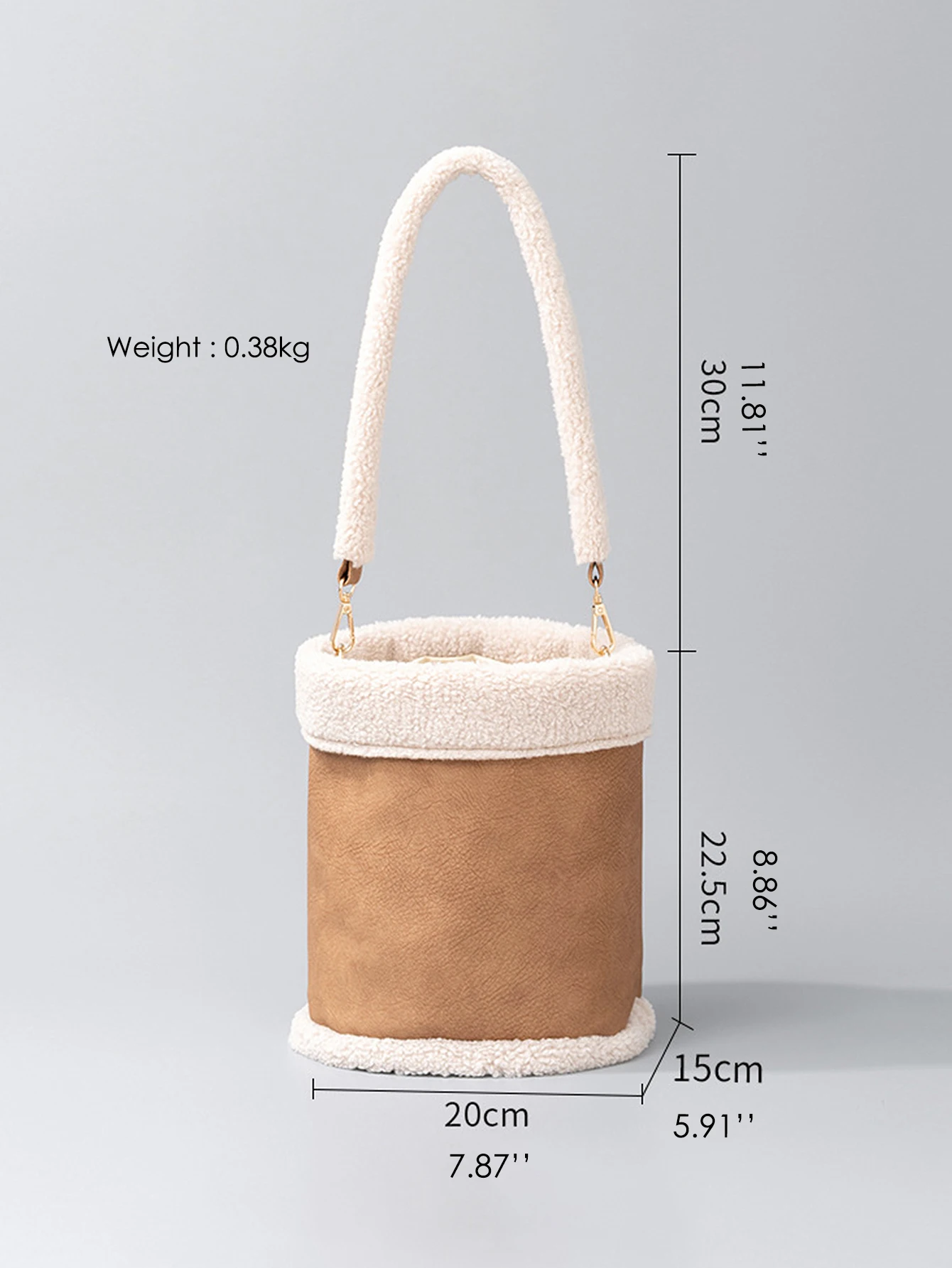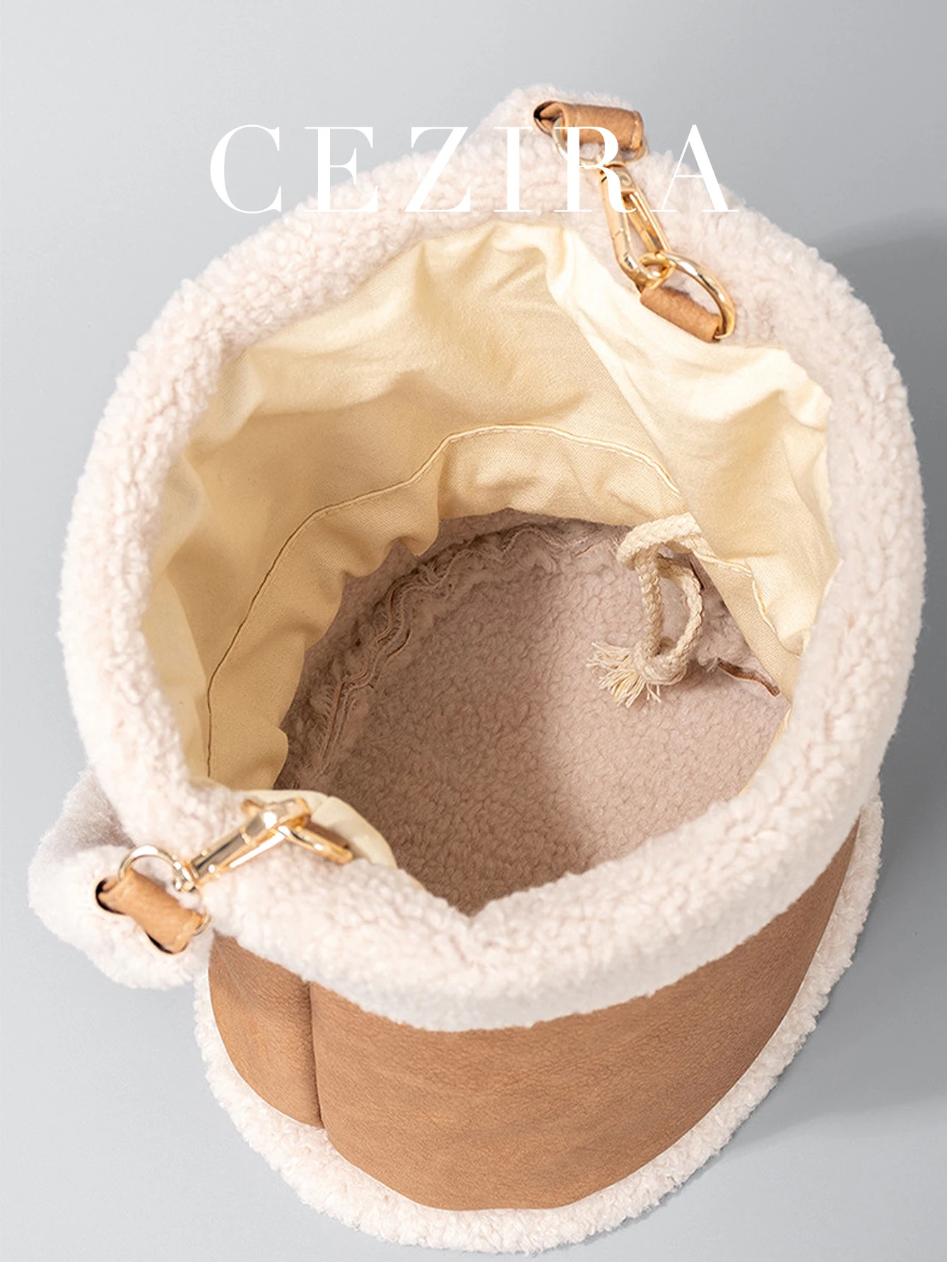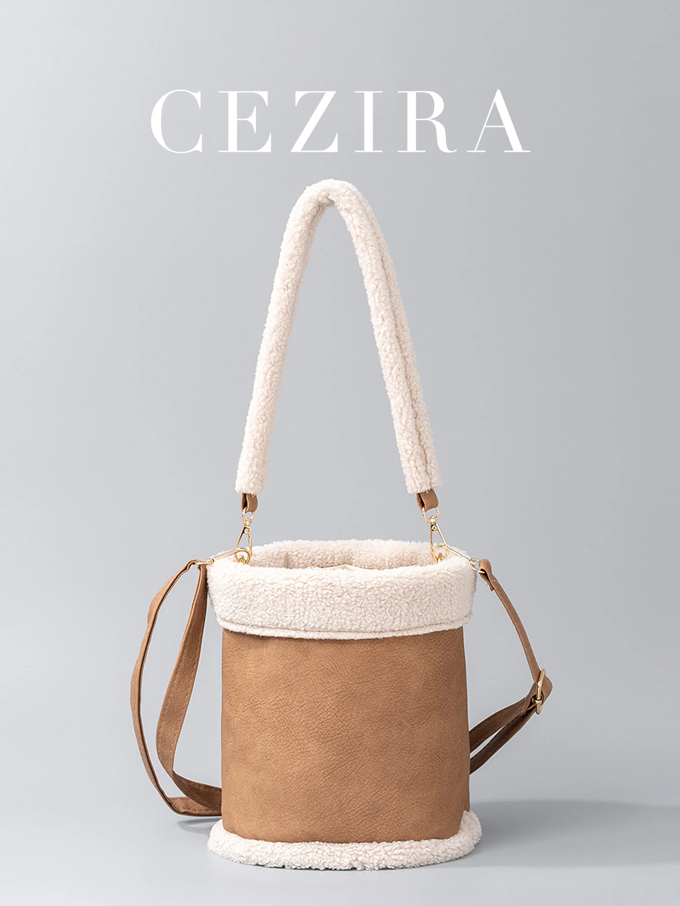 CEZIRA Winter Style Women’s Fashion Faux Fur&PU Leather Patchwork Handbag Soft Fluffy Bucket Cross body BarreL Shoulder Bag