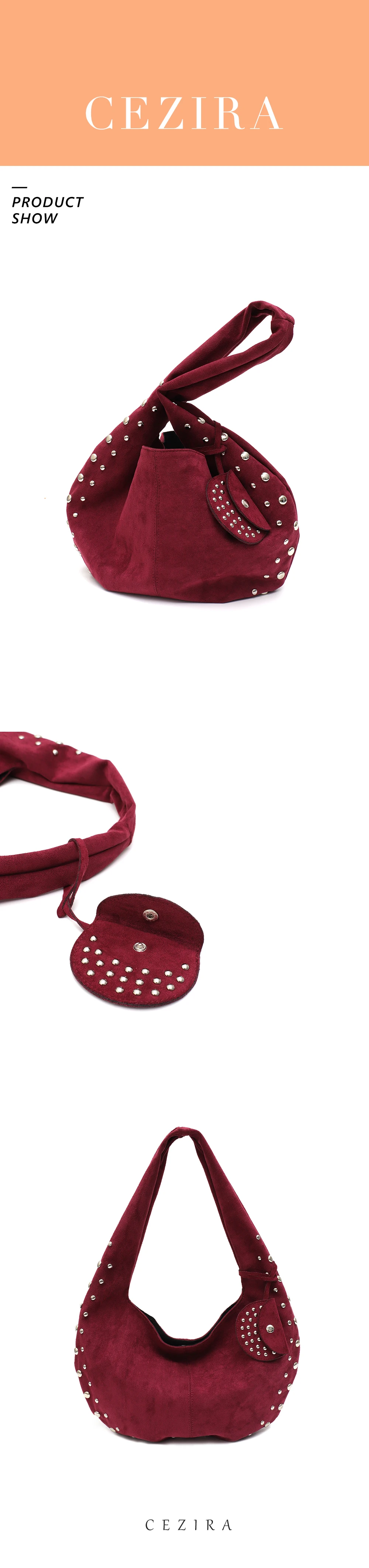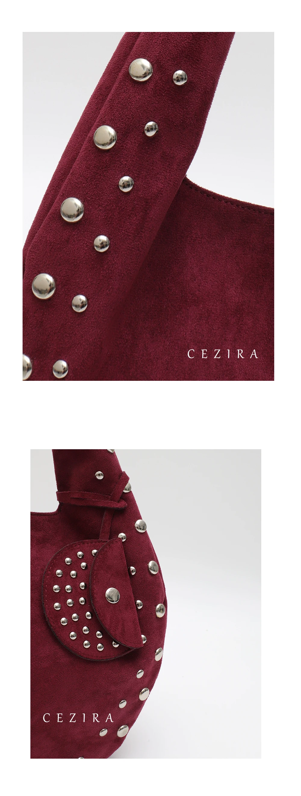 CEZIRA Women Fashion Elegant Rivets Decor Hobo Handbag Faux Suede Fabric Shoulder Bag with a Mini Coin Purse Casual Daily Large