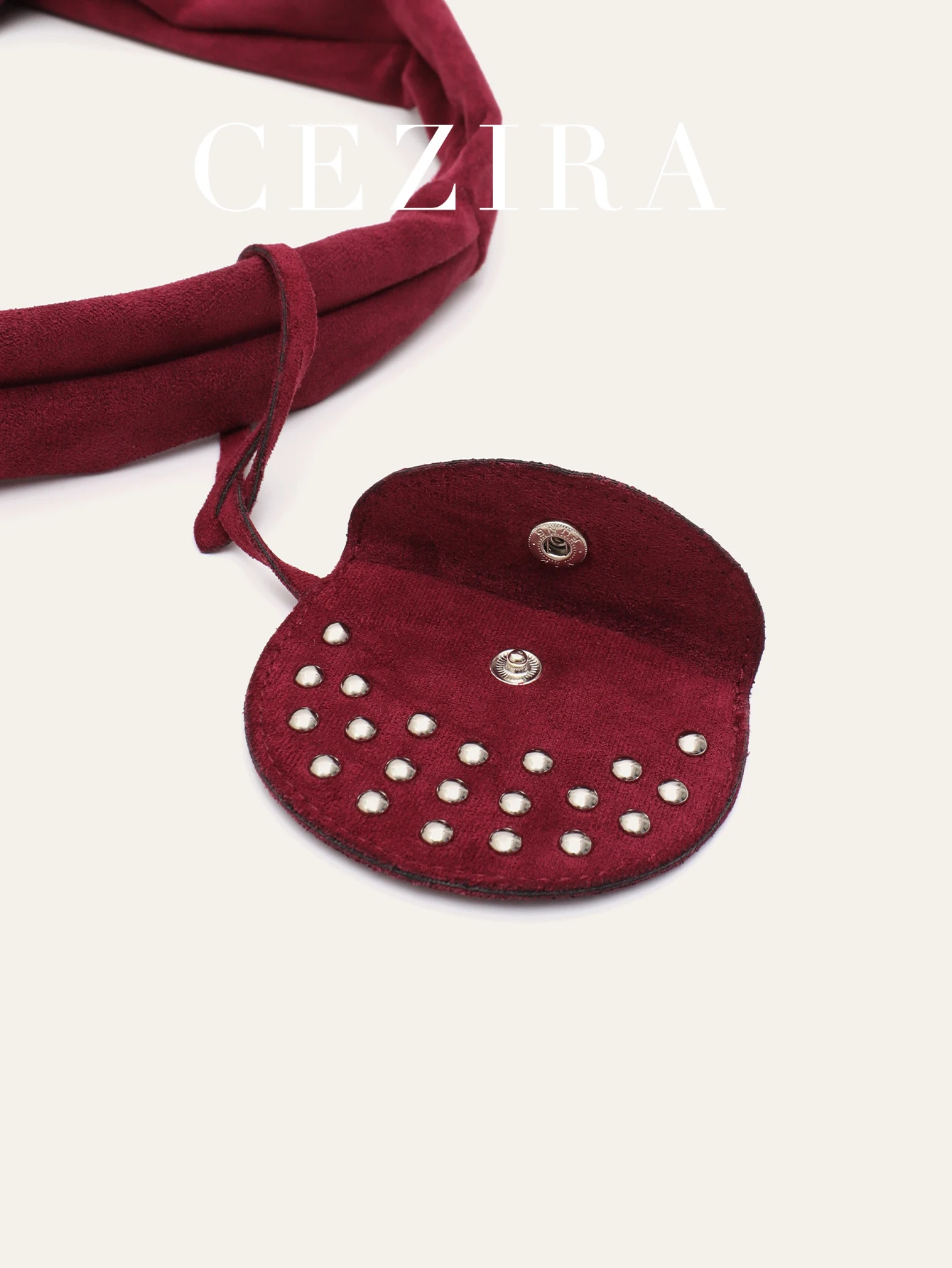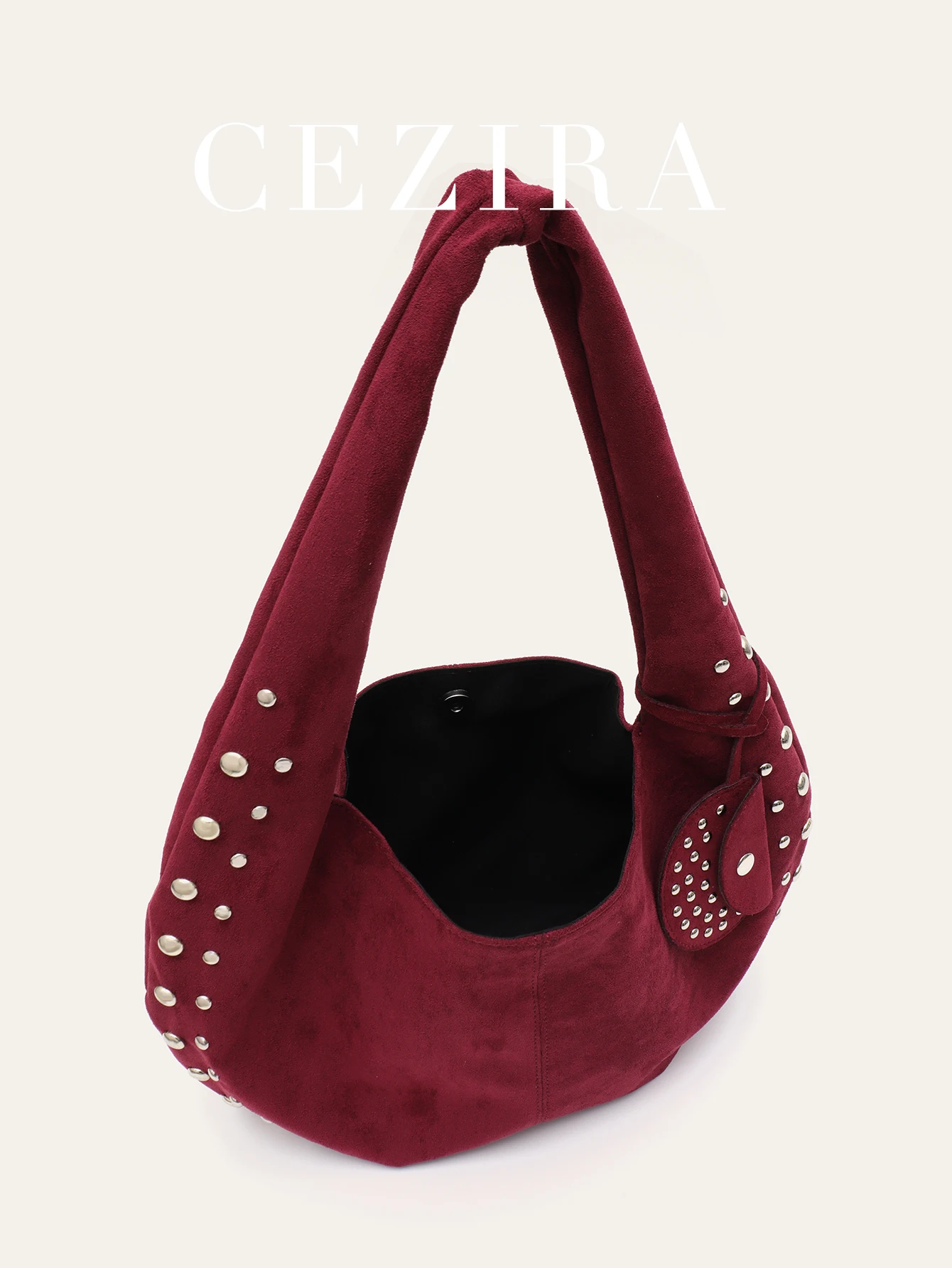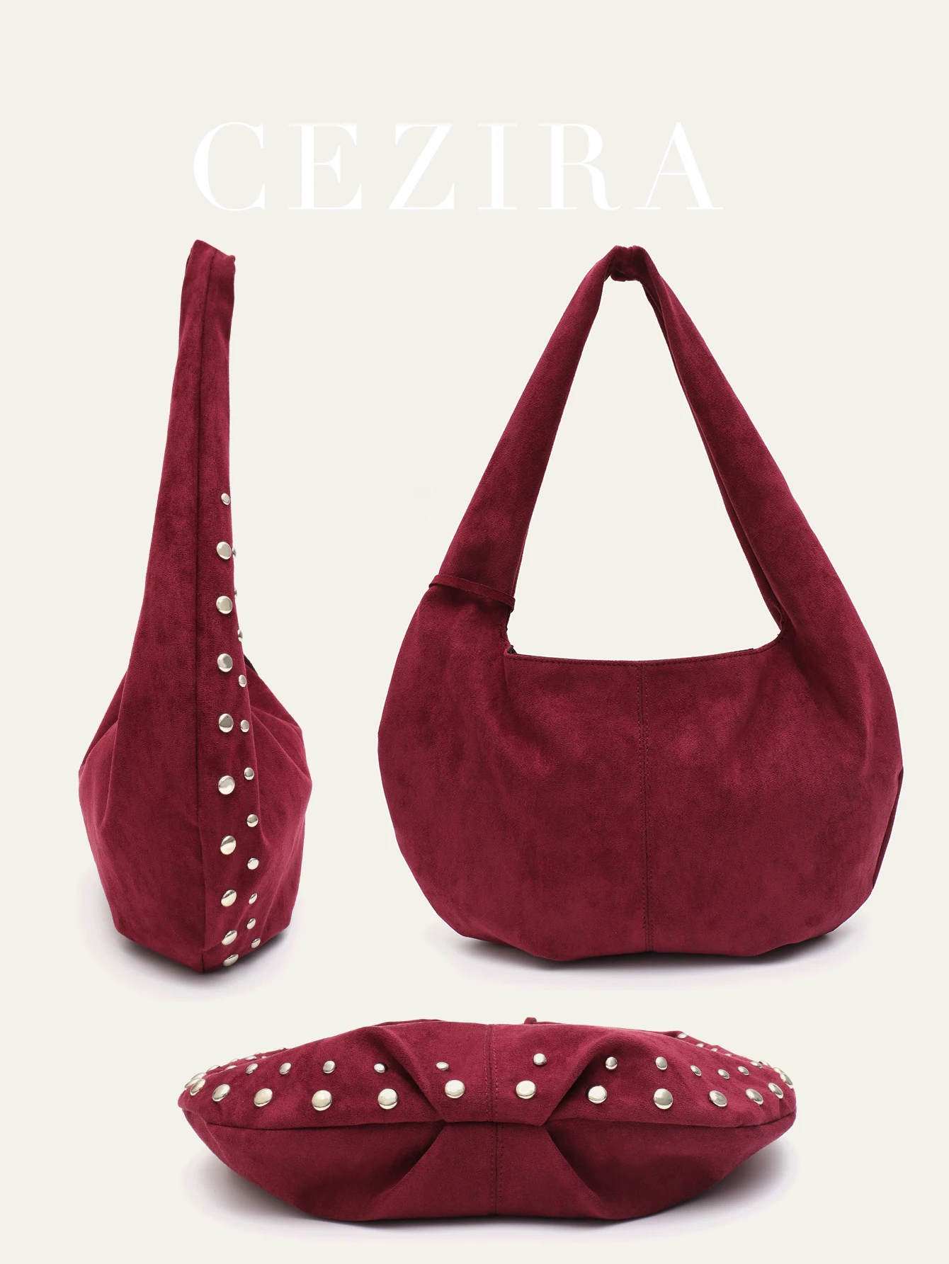 CEZIRA Women Fashion Elegant Rivets Decor Hobo Handbag Faux Suede Fabric Shoulder Bag with a Mini Coin Purse Casual Daily Large