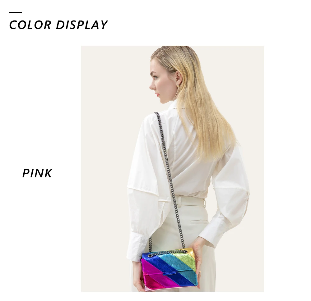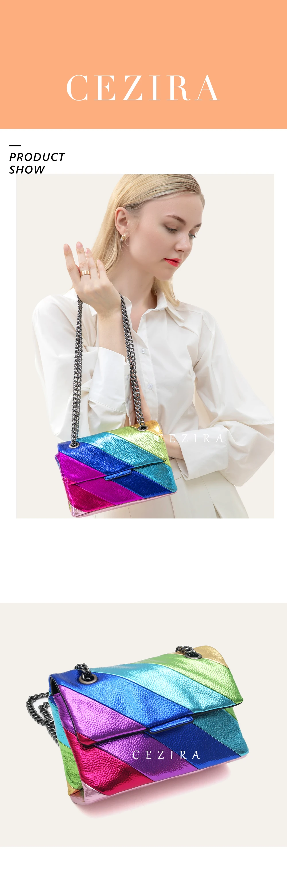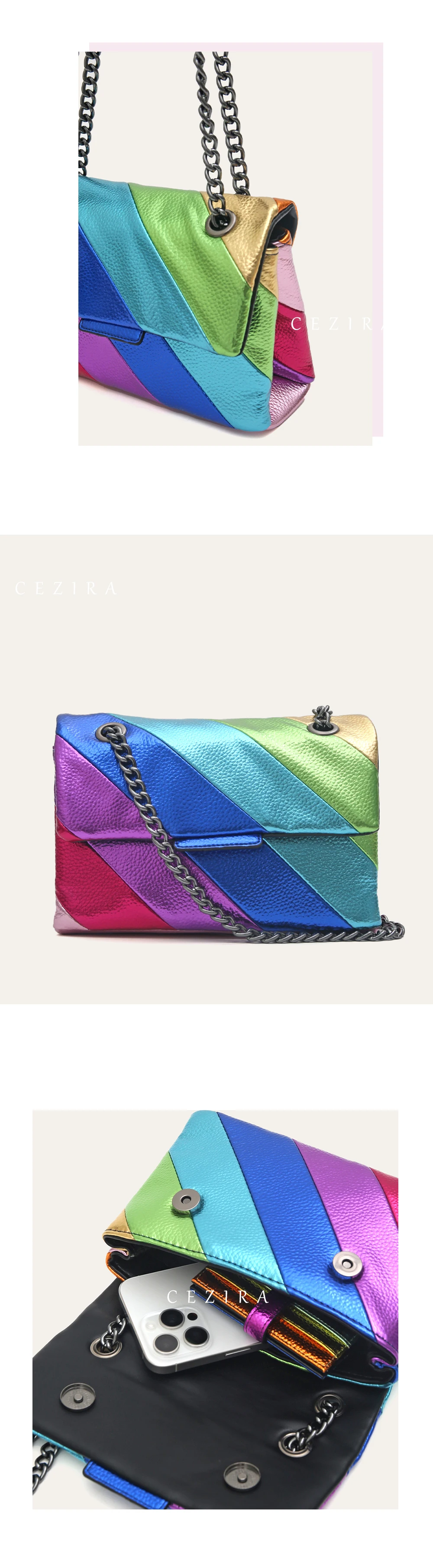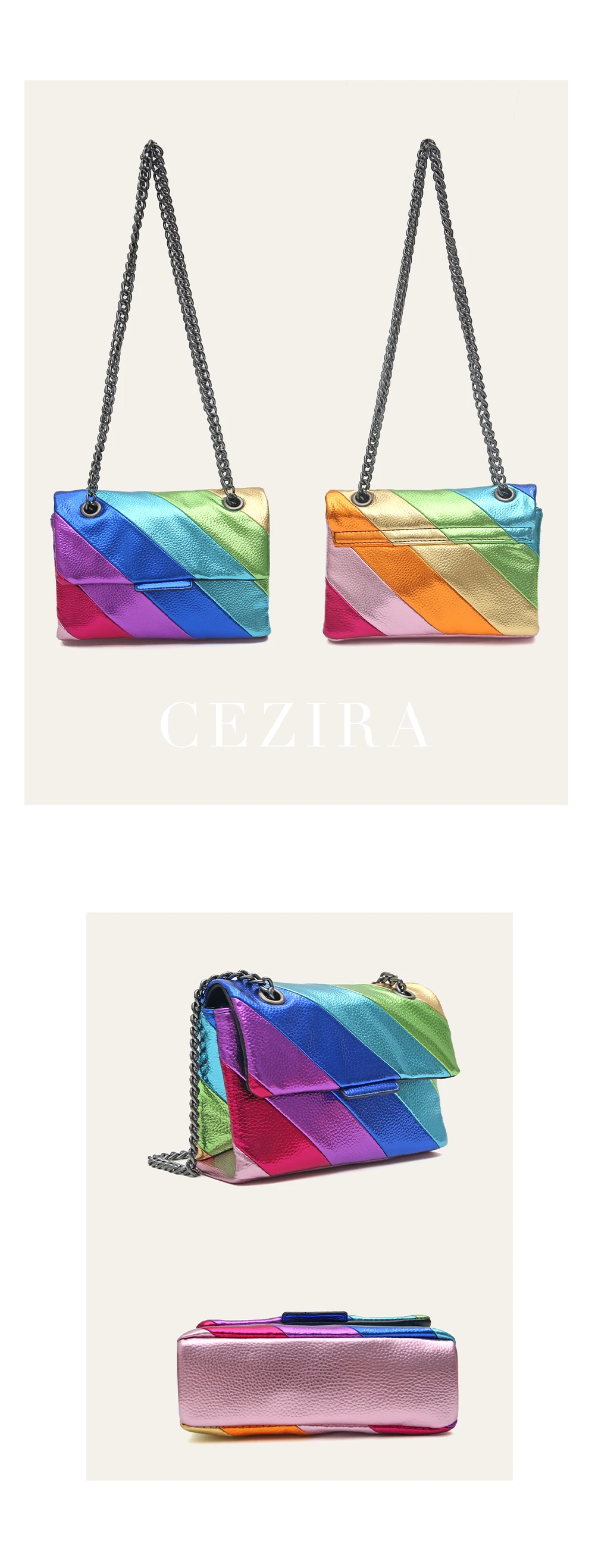 CEZIRA Women Fashion Metallic Rainbow Color Stripes PU Vegan Leather Bag Small Square Magnet Flap Cover Metal Chain Cross body