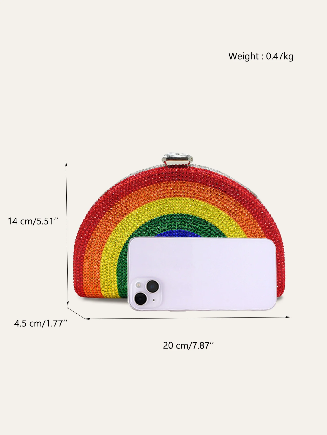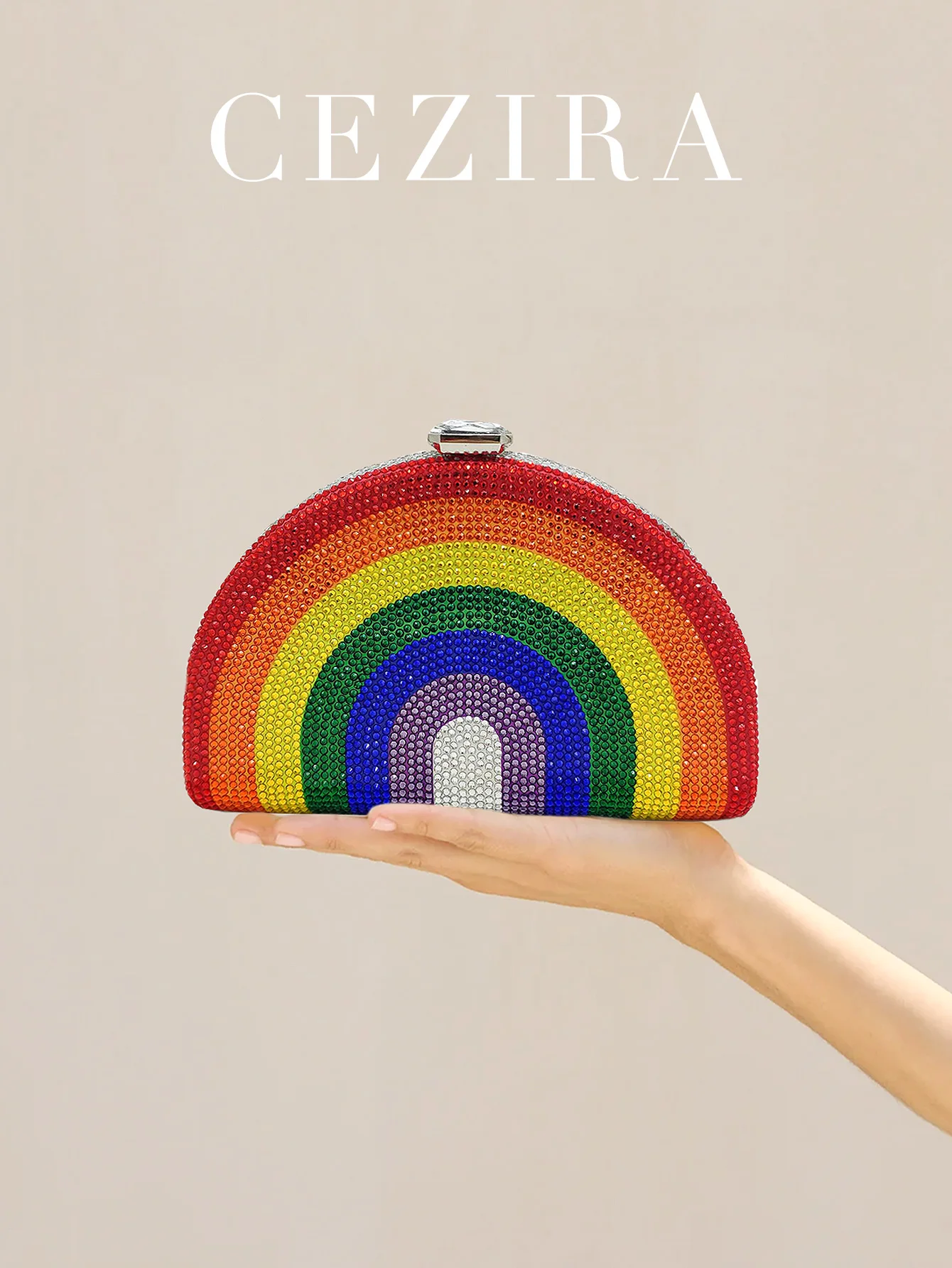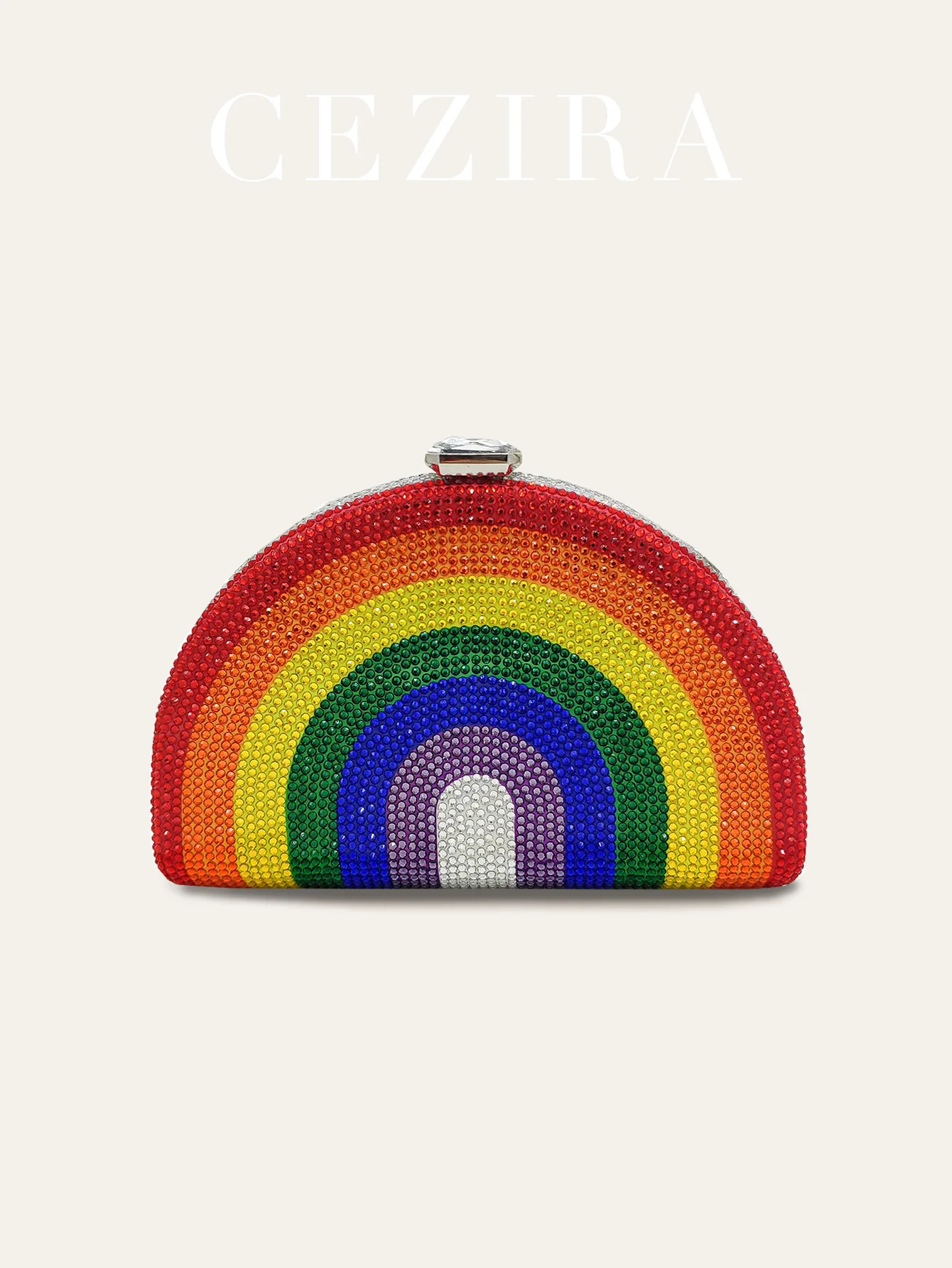 CEZIRA Women Luxury Glamorous Rainbow Color Rhinestone Evening Bag Colorful Stripes Half-round Dome Clutch Handbag Party Purse