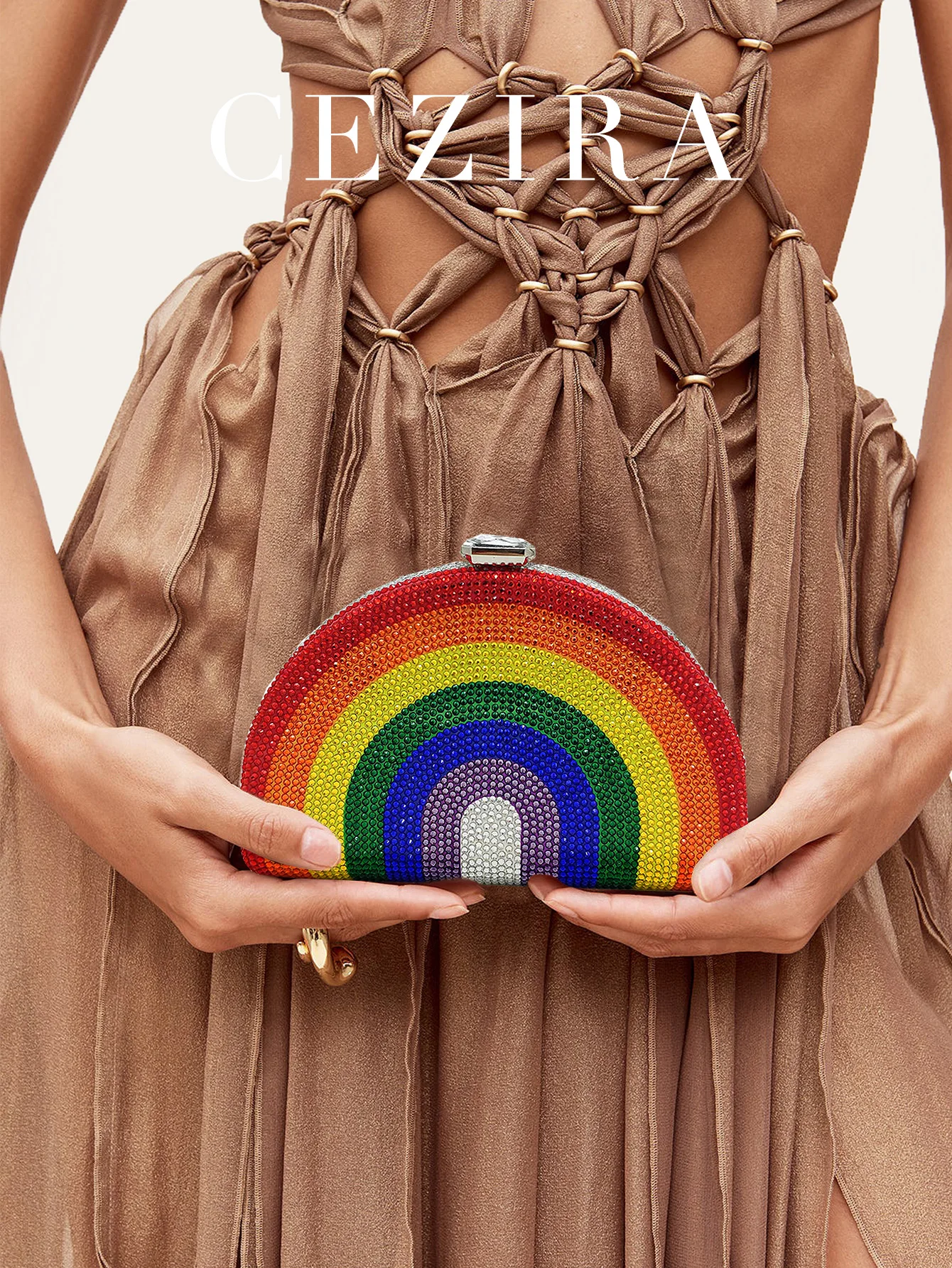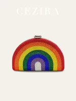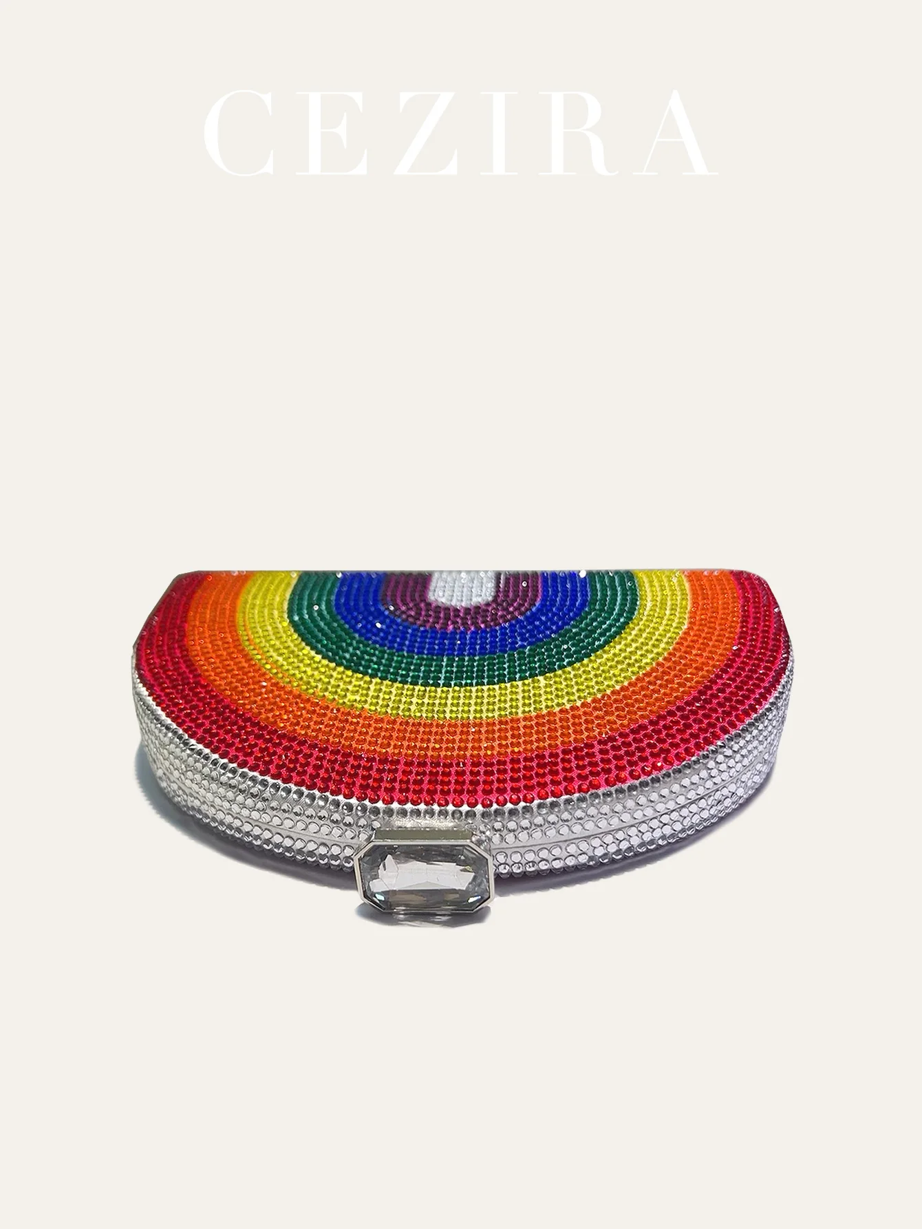 CEZIRA Women Luxury Glamorous Rainbow Color Rhinestone Evening Bag Colorful Stripes Half-round Dome Clutch Handbag Party Purse