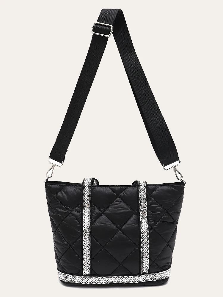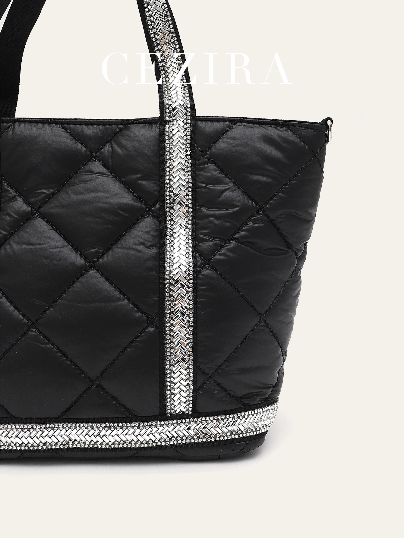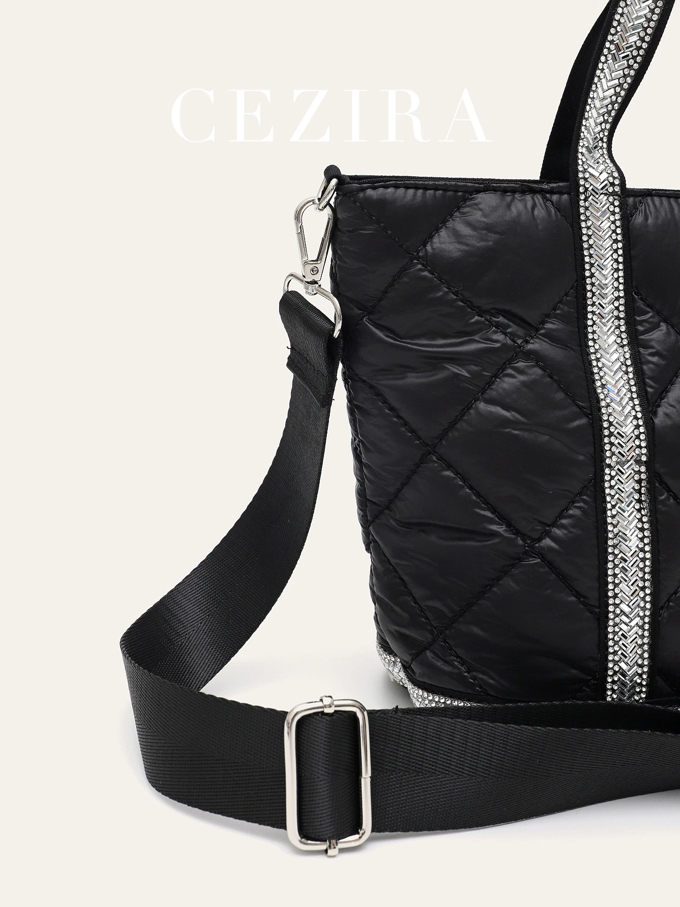 CEZIRA Women Luxury Rhinestones Decor Soft Nylon Fabric Quilted Top-handle Bucket Wide Adjustable Shoulder Cross Body Tote Bag