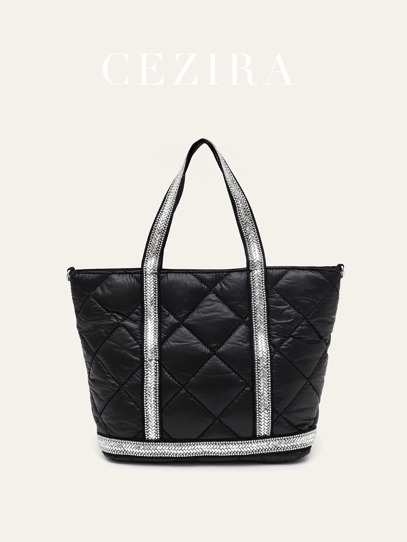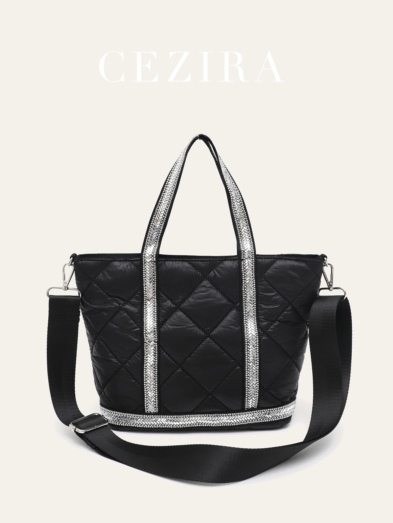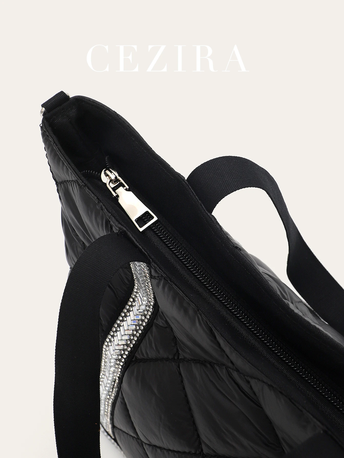 CEZIRA Women Luxury Rhinestones Decor Soft Nylon Fabric Quilted Top-handle Bucket Wide Adjustable Shoulder Cross Body Tote Bag