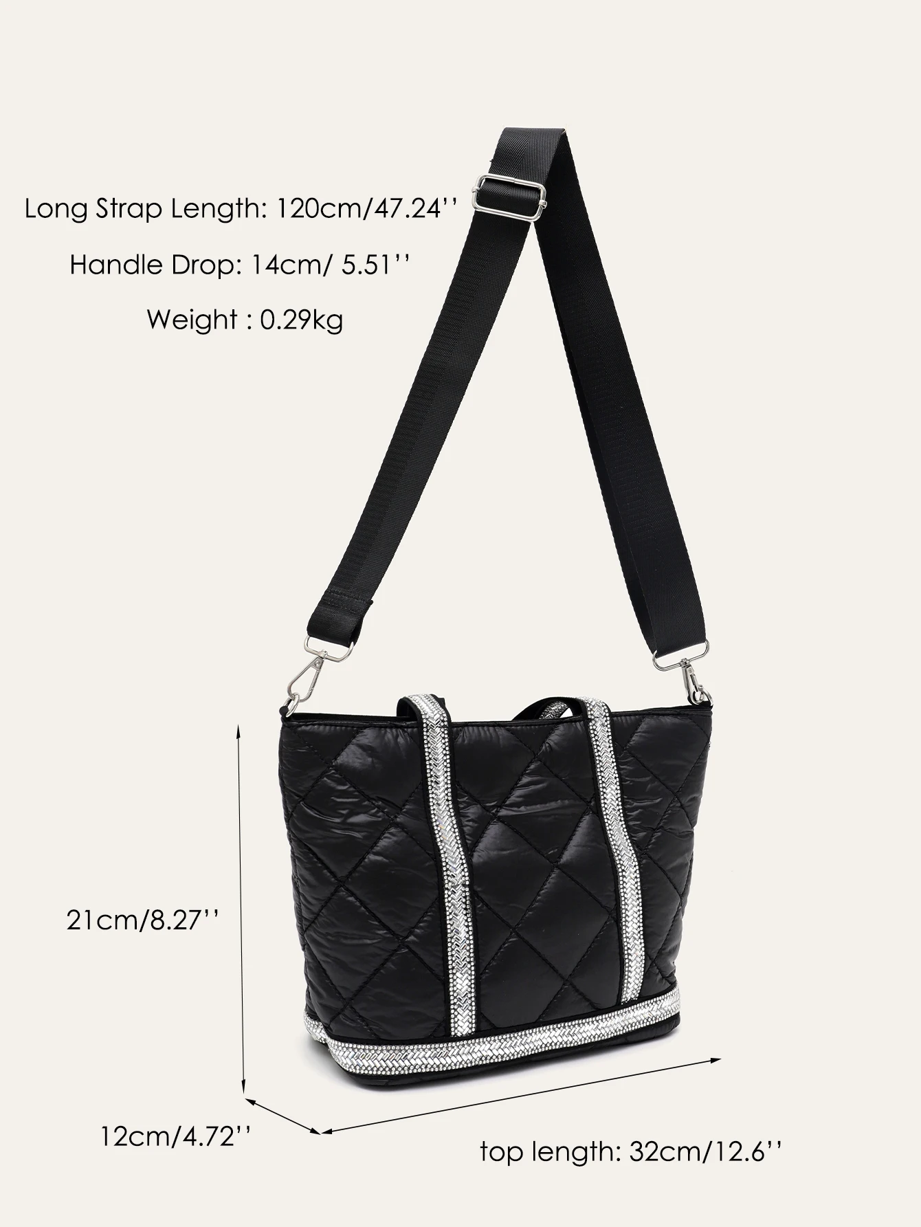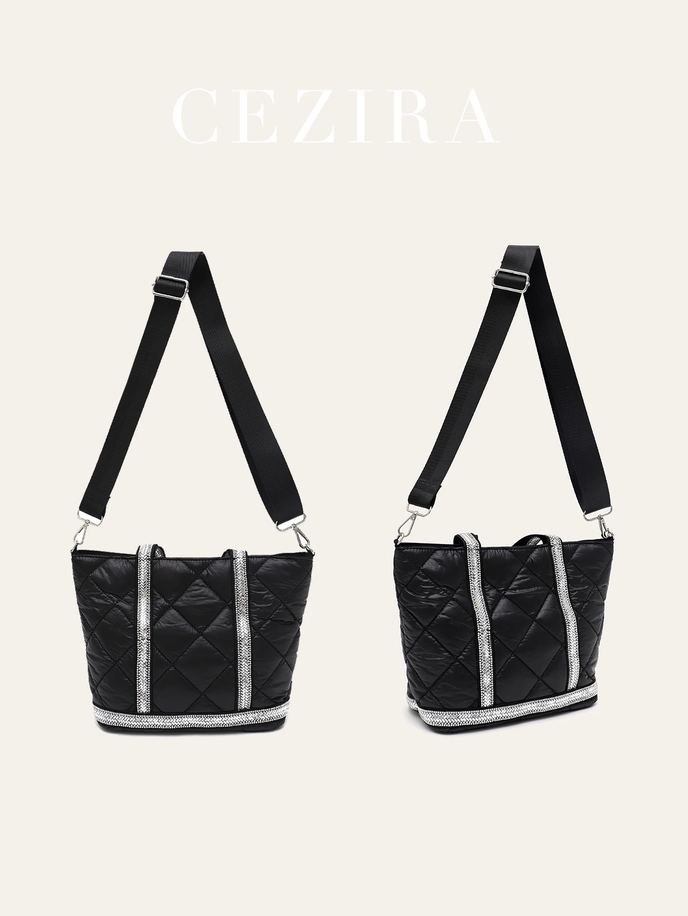 CEZIRA Women Luxury Rhinestones Decor Soft Nylon Fabric Quilted Top-handle Bucket Wide Adjustable Shoulder Cross Body Tote Bag