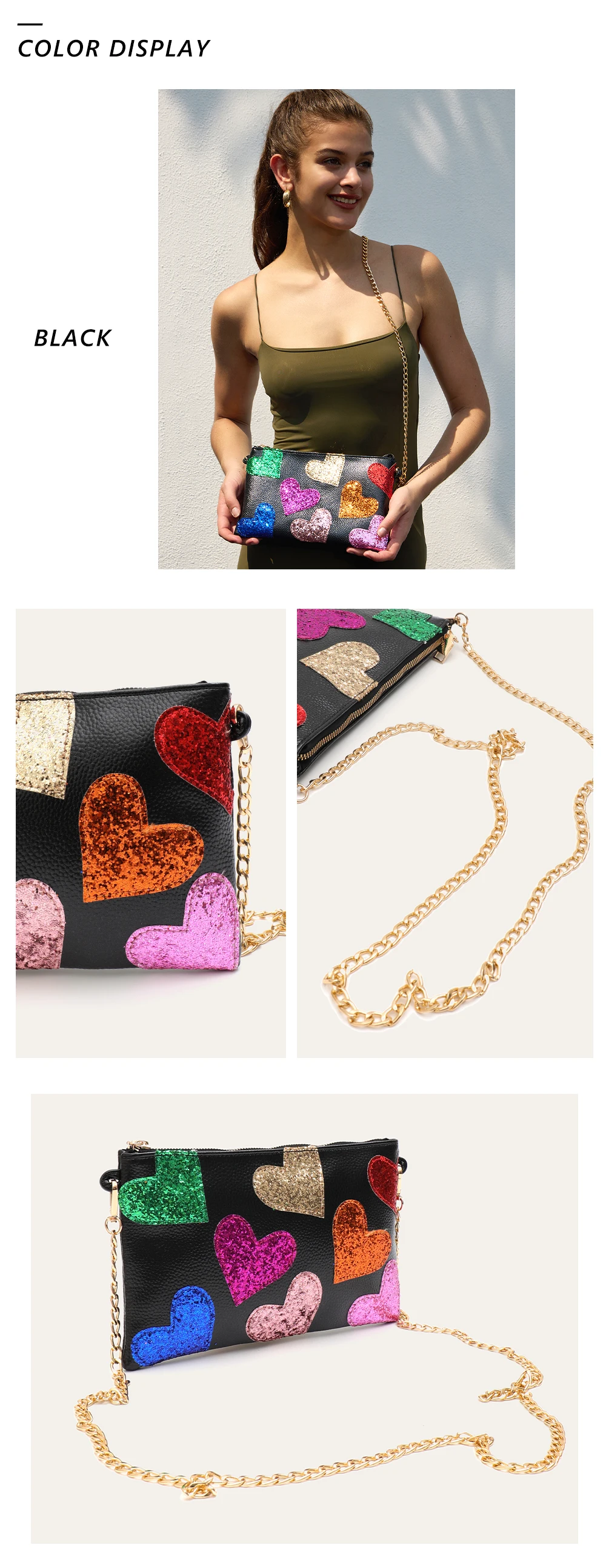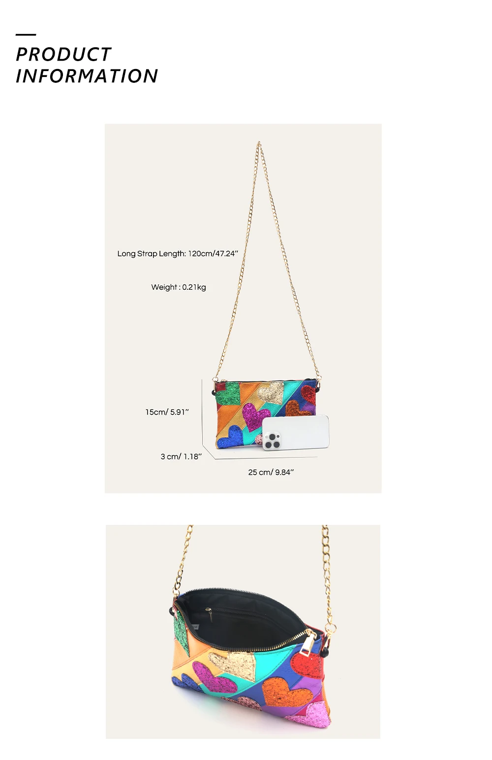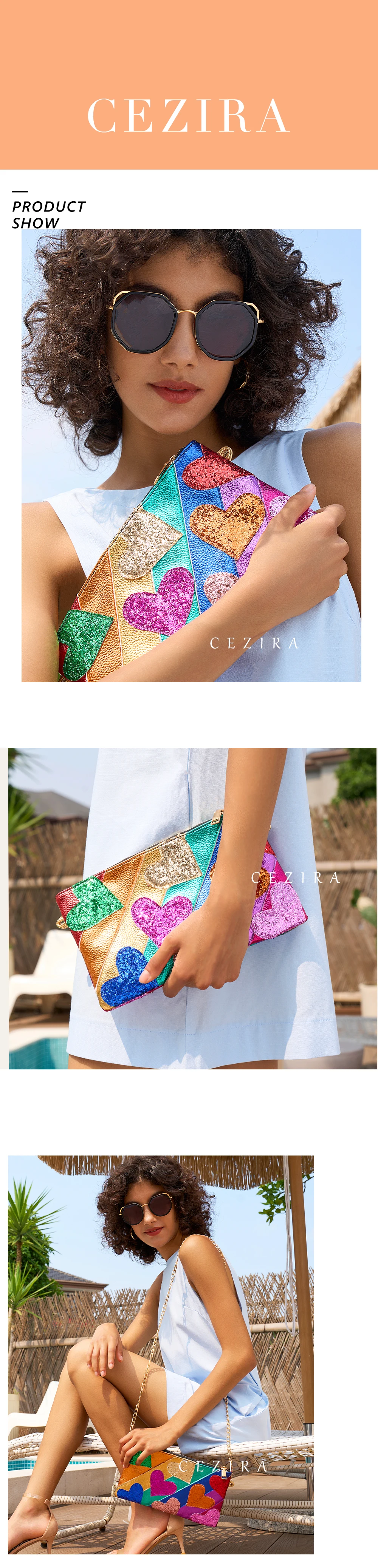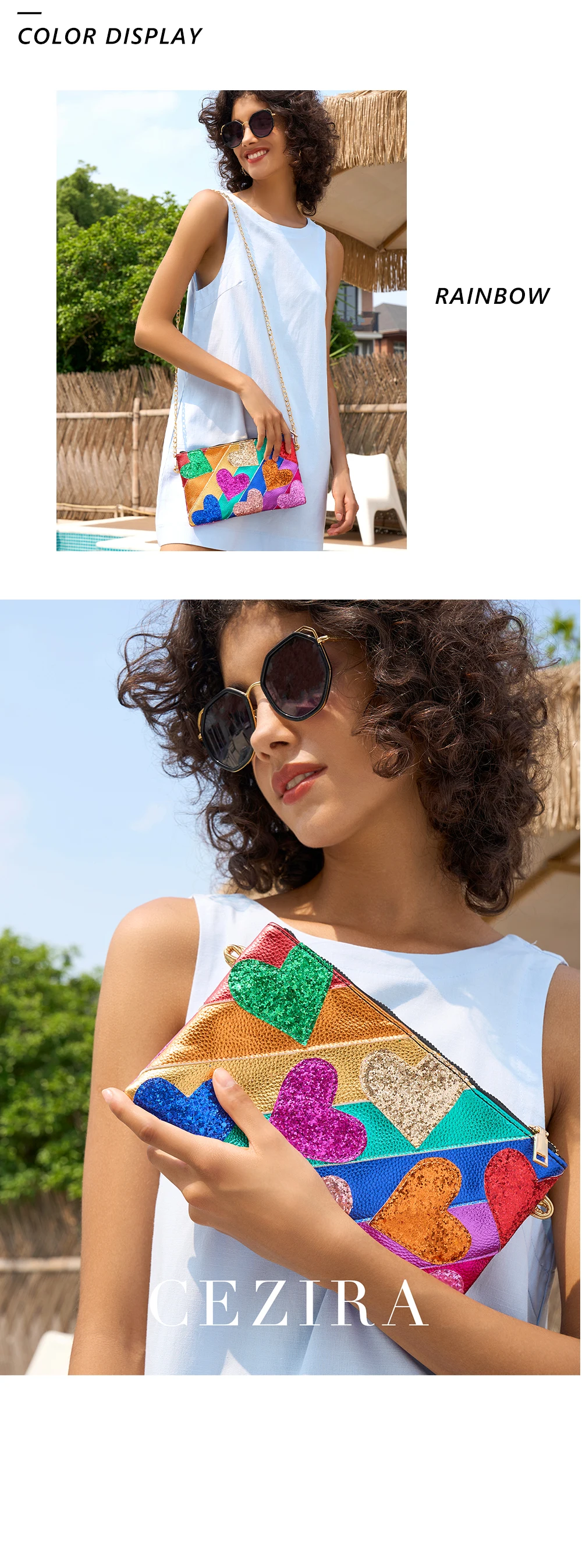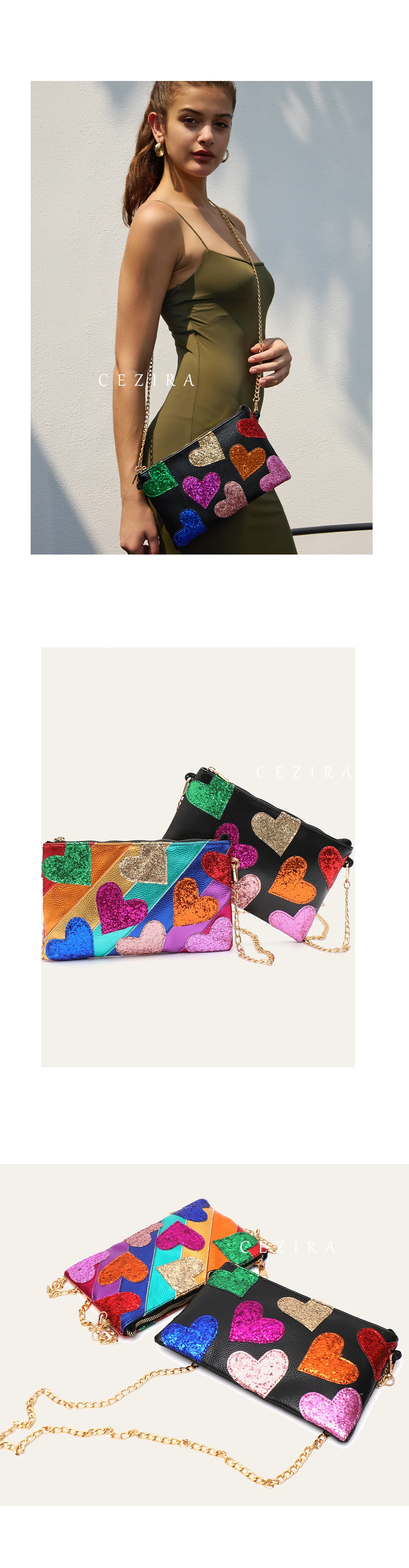 CEZIRA Women Luxury Shiny Sequins PU Leather Patchwork Clutch Bag Colorful Heart shaped Applique Zip Handbag Long Chain Fashion
