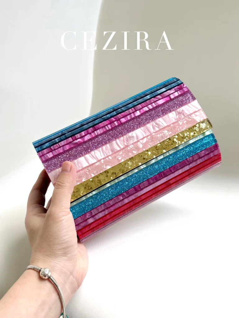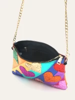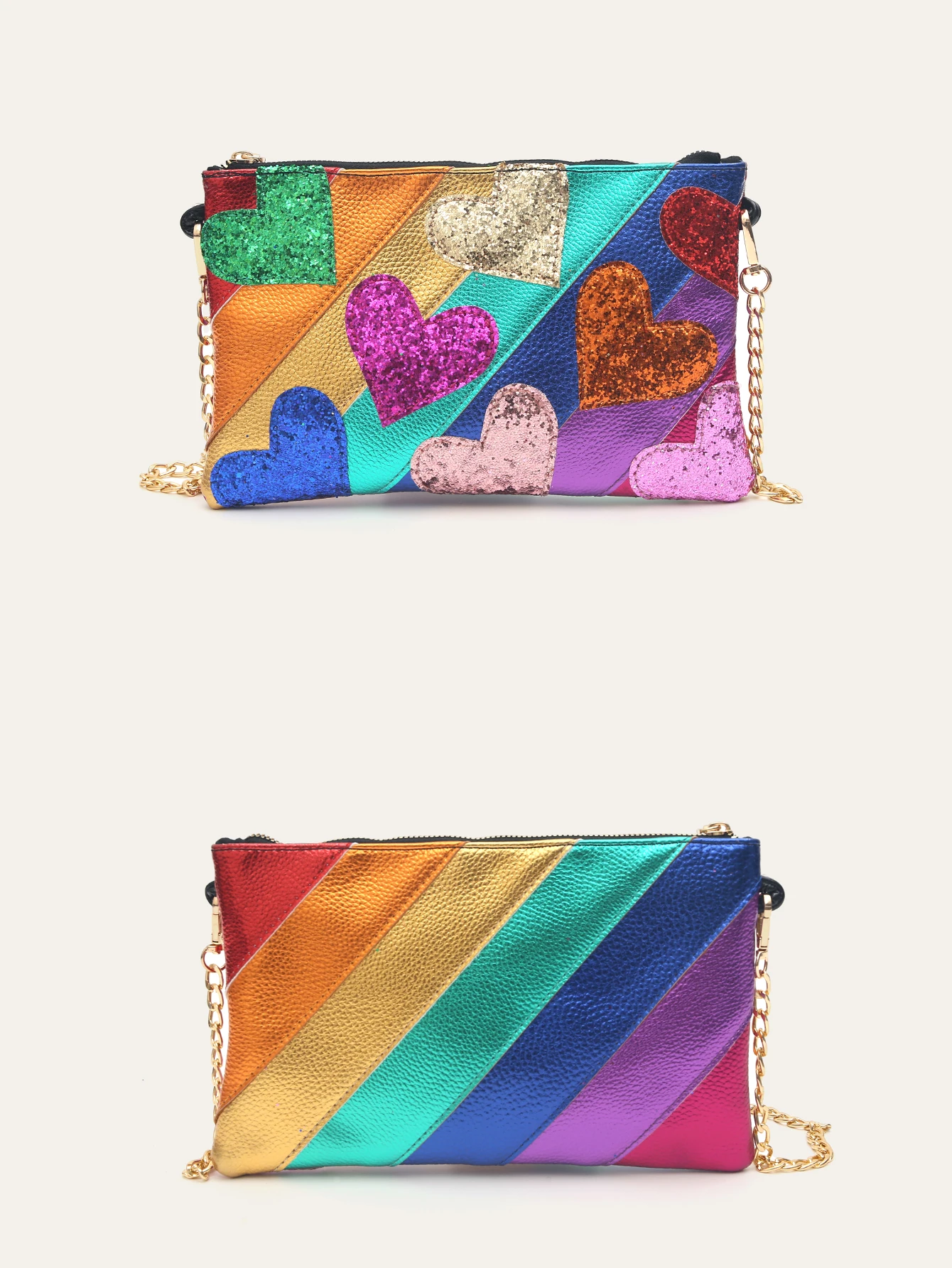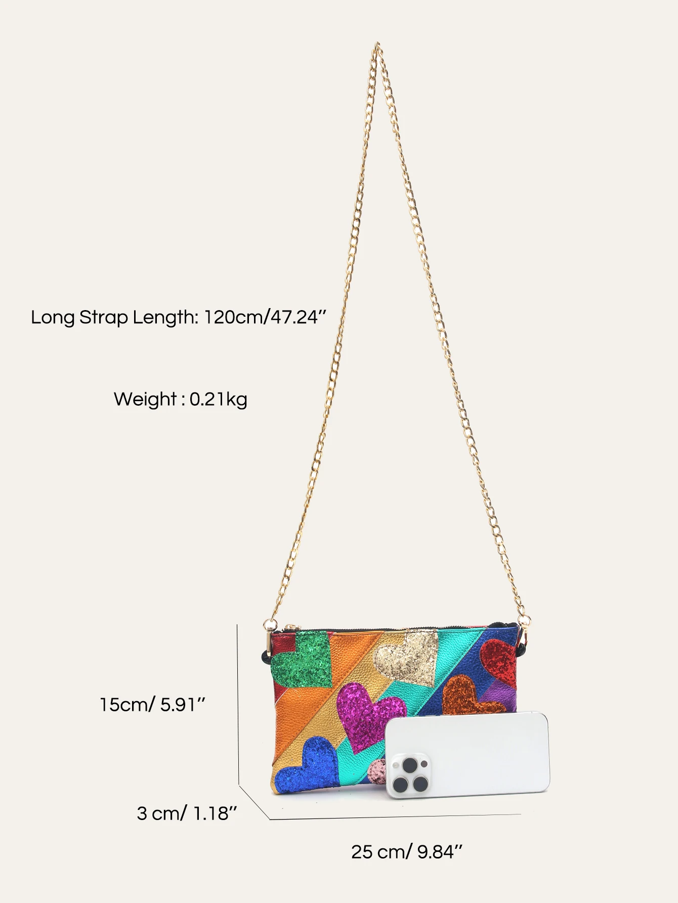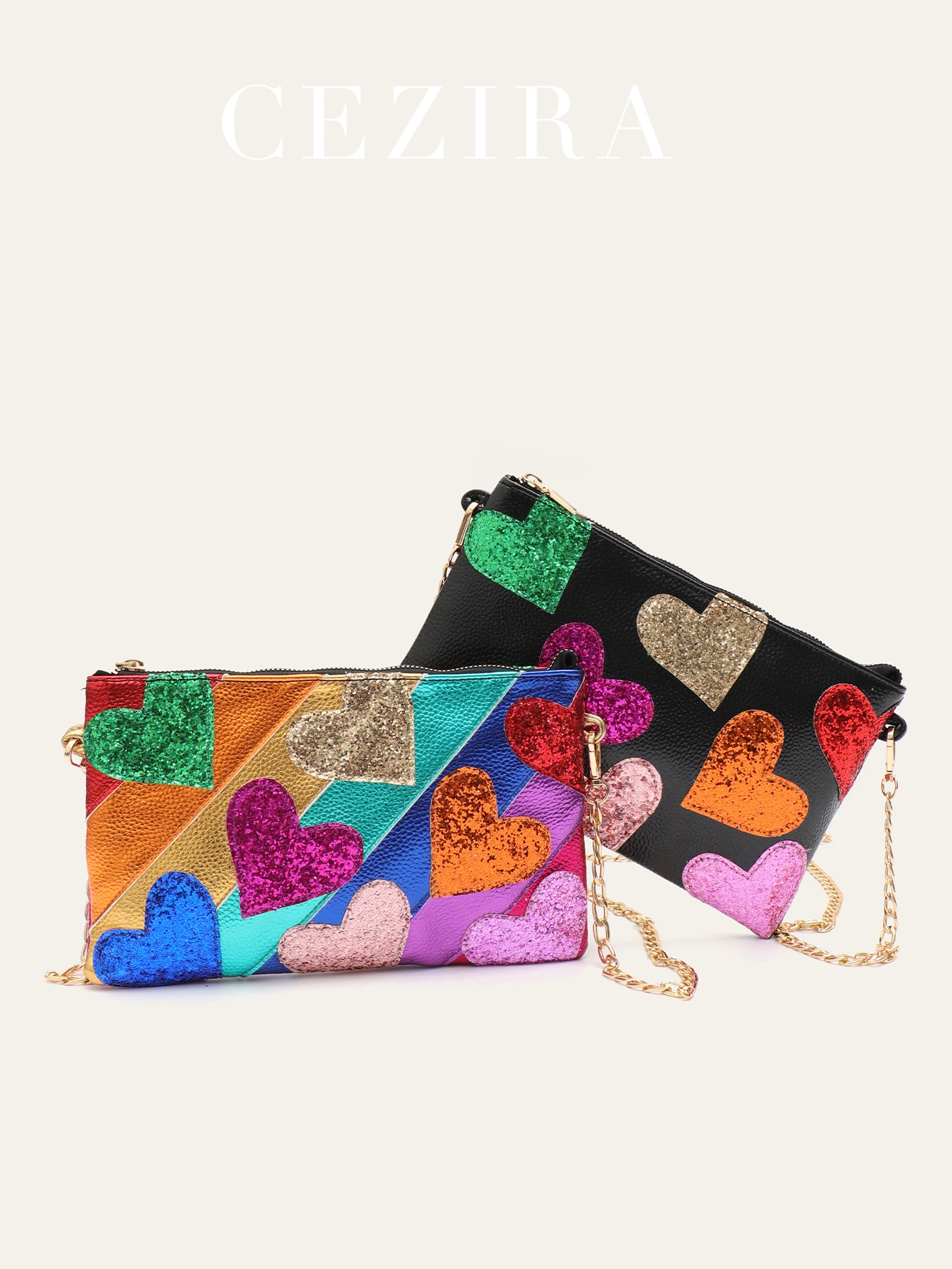 CEZIRA Women Luxury Shiny Sequins PU Leather Patchwork Clutch Bag Colorful Heart shaped Applique Zip Handbag Long Chain Fashion