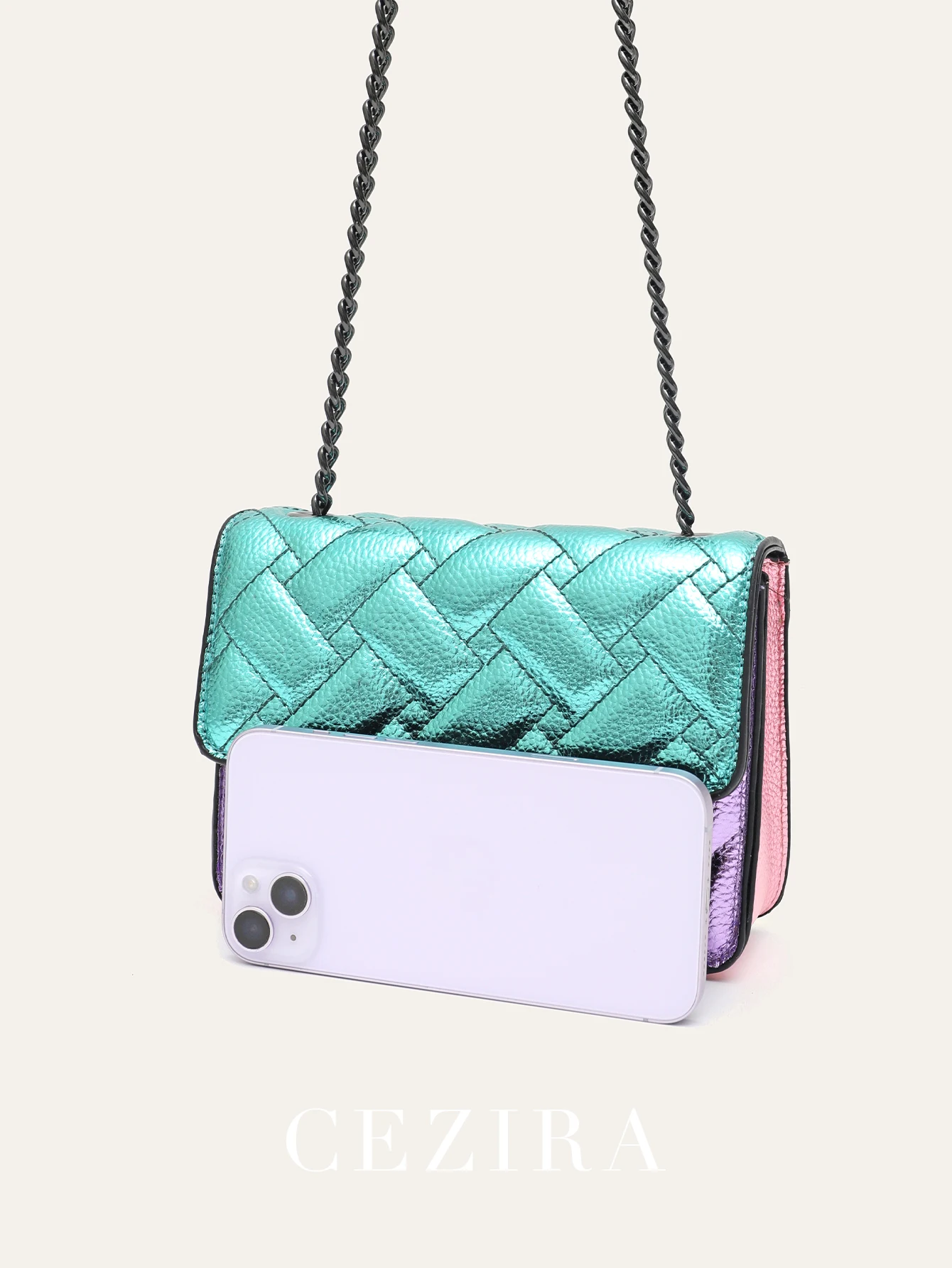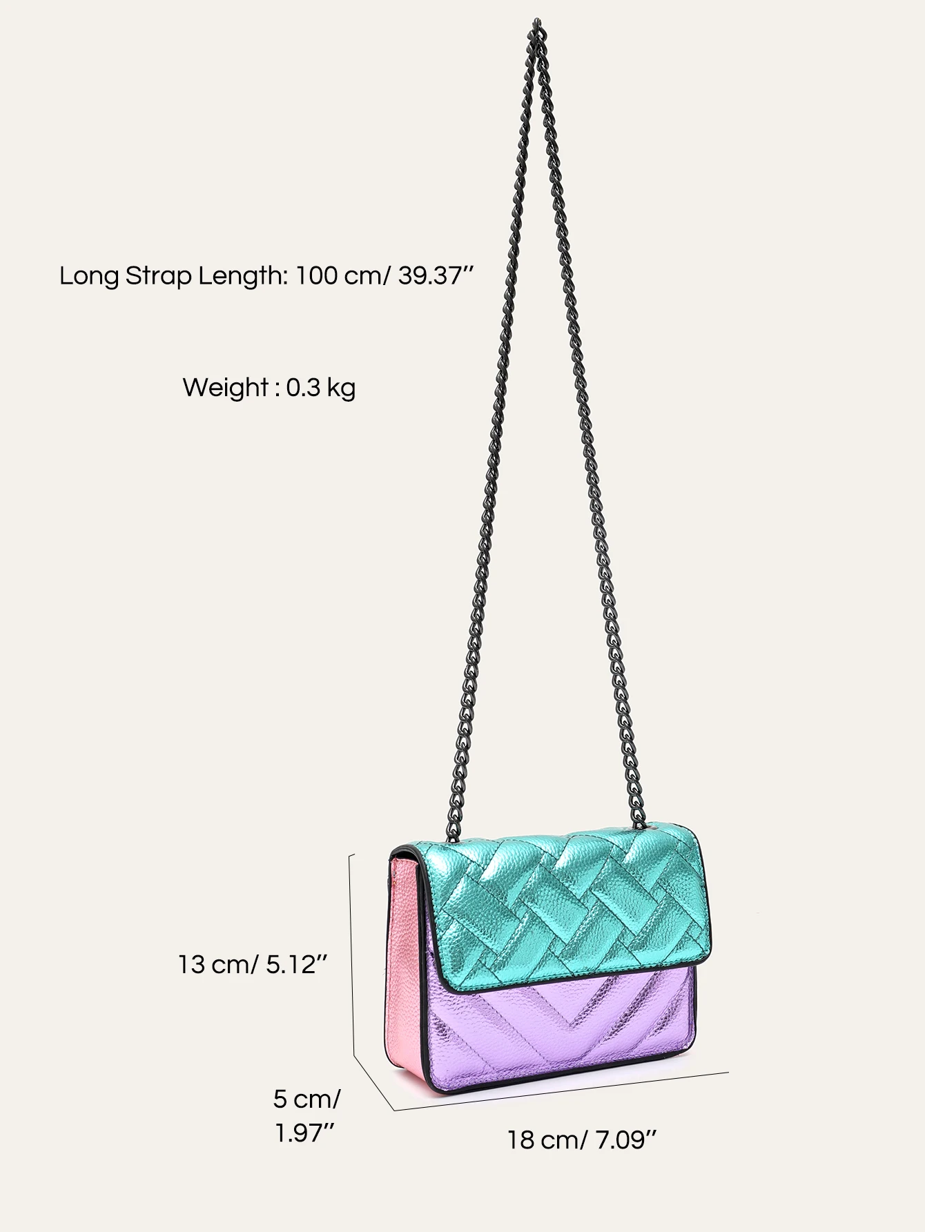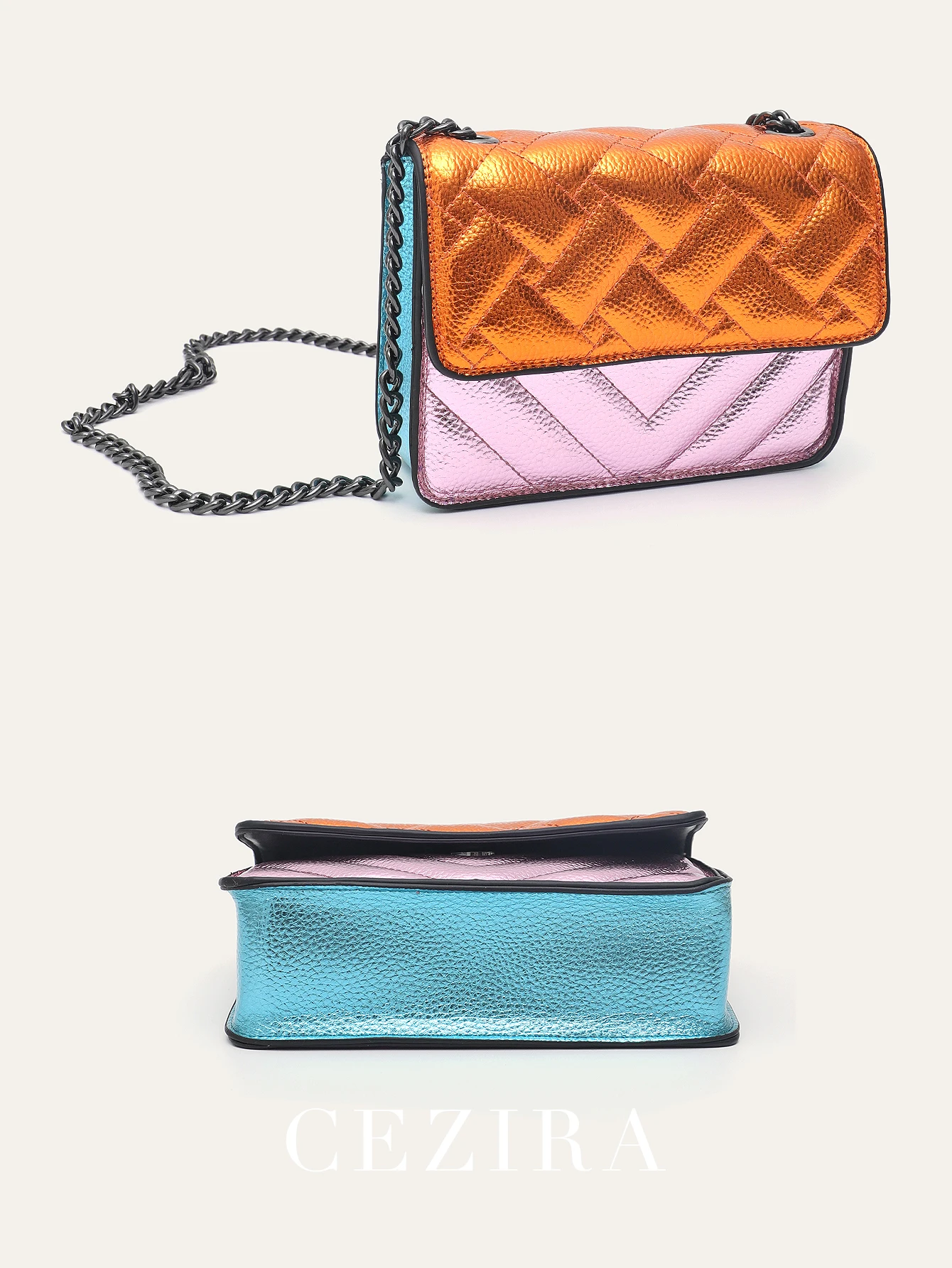 CEZIRA Women PU Leather Handbag Metallic Colorful Patchwork Quilted Magnet Flap Cover Long Chain Square Crossbody Shoulder Bag