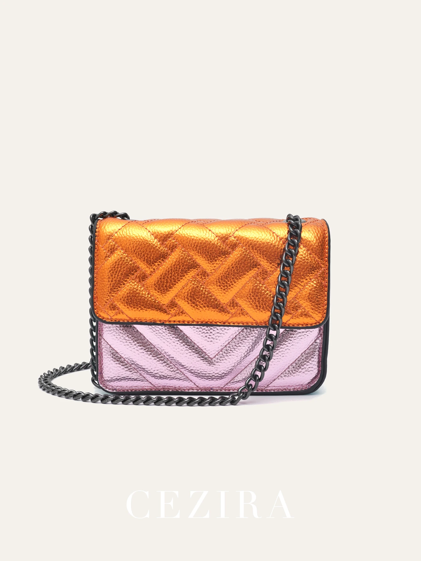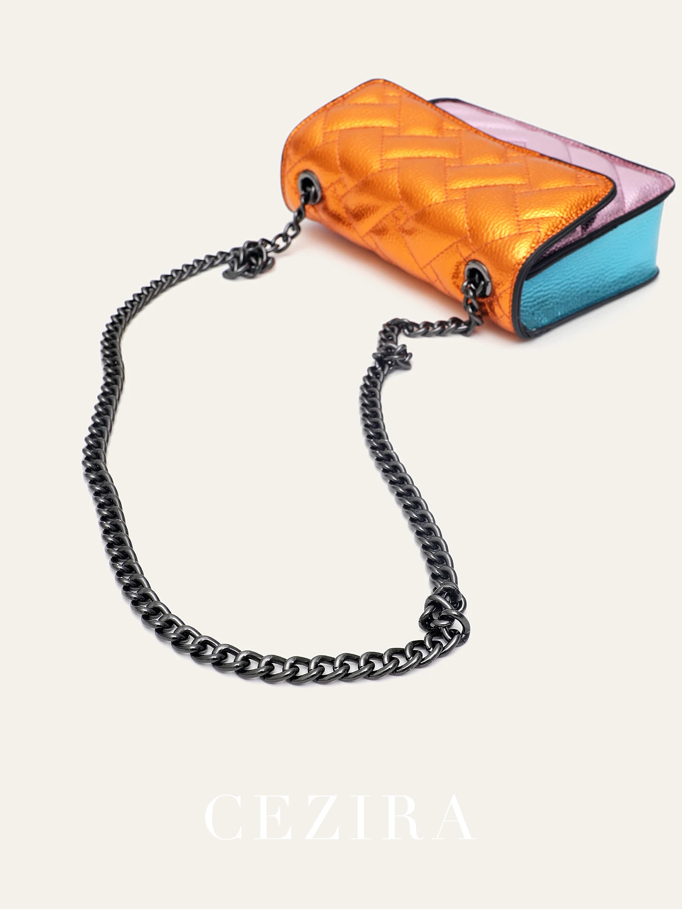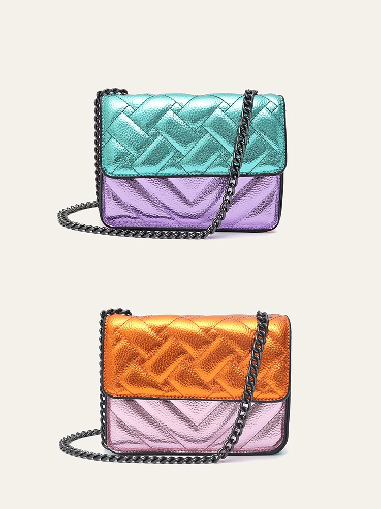 CEZIRA Women PU Leather Handbag Metallic Colorful Patchwork Quilted Magnet Flap Cover Long Chain Square Crossbody Shoulder Bag