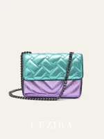 CEZIRA Women PU Leather Handbag Metallic Colorful Patchwork Quilted Magnet Flap Cover Long Chain Square Crossbody Shoulder Bag