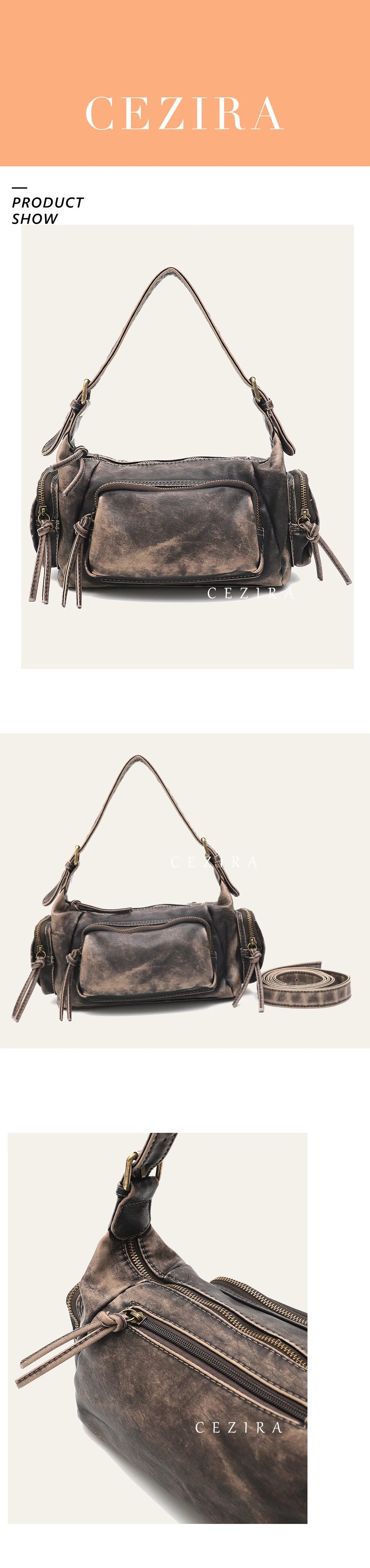 CEZIRA Women Retro Cool Preppy Street Style Shoulder Bag Washed PU Vegan Leather Vintage Functional Practical Cross body Handbag