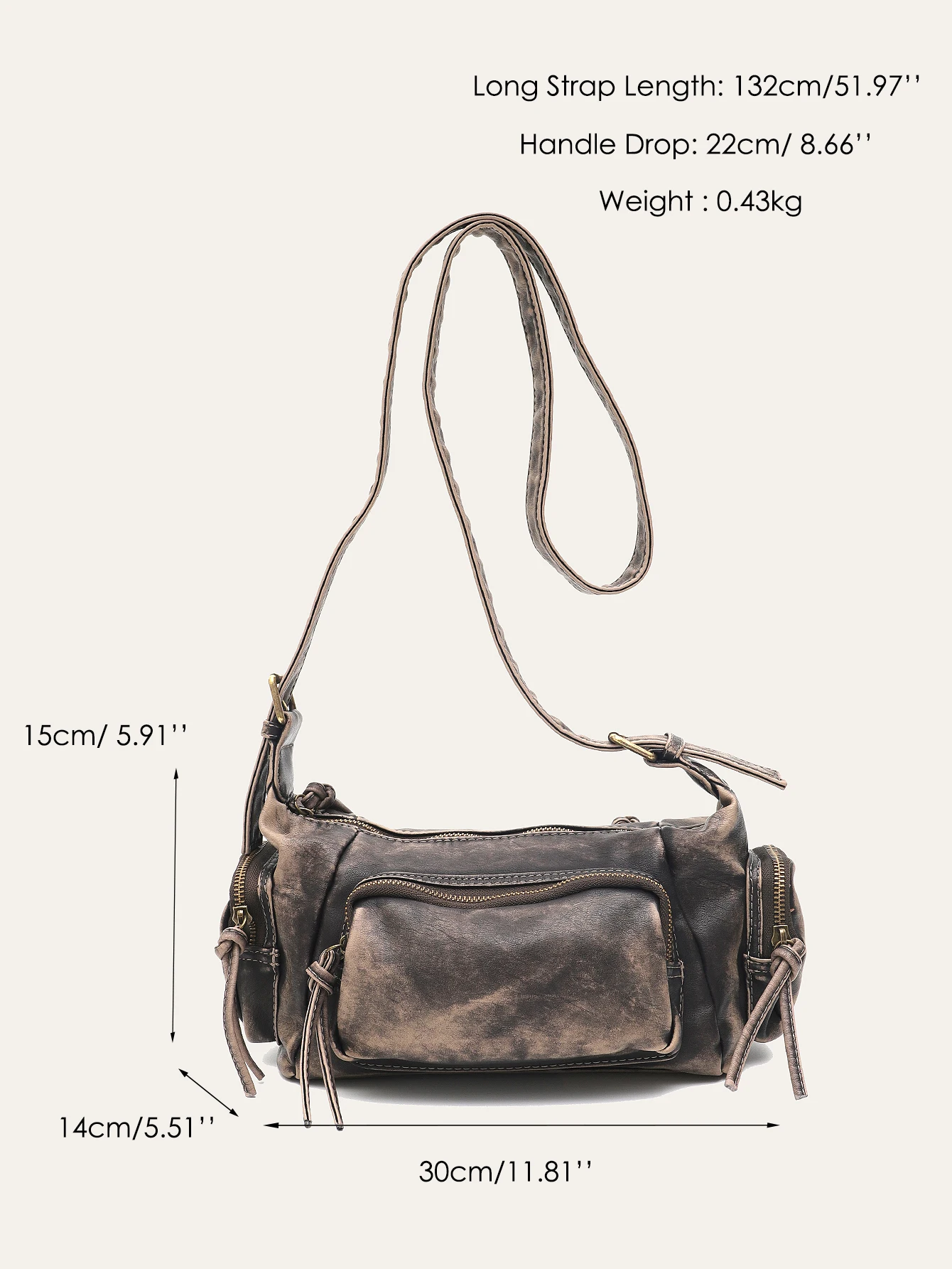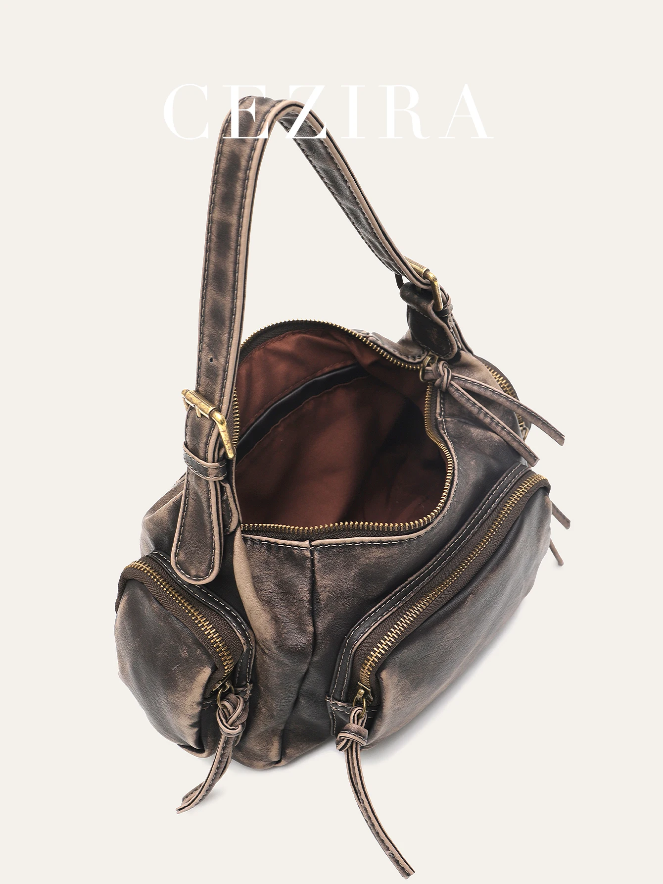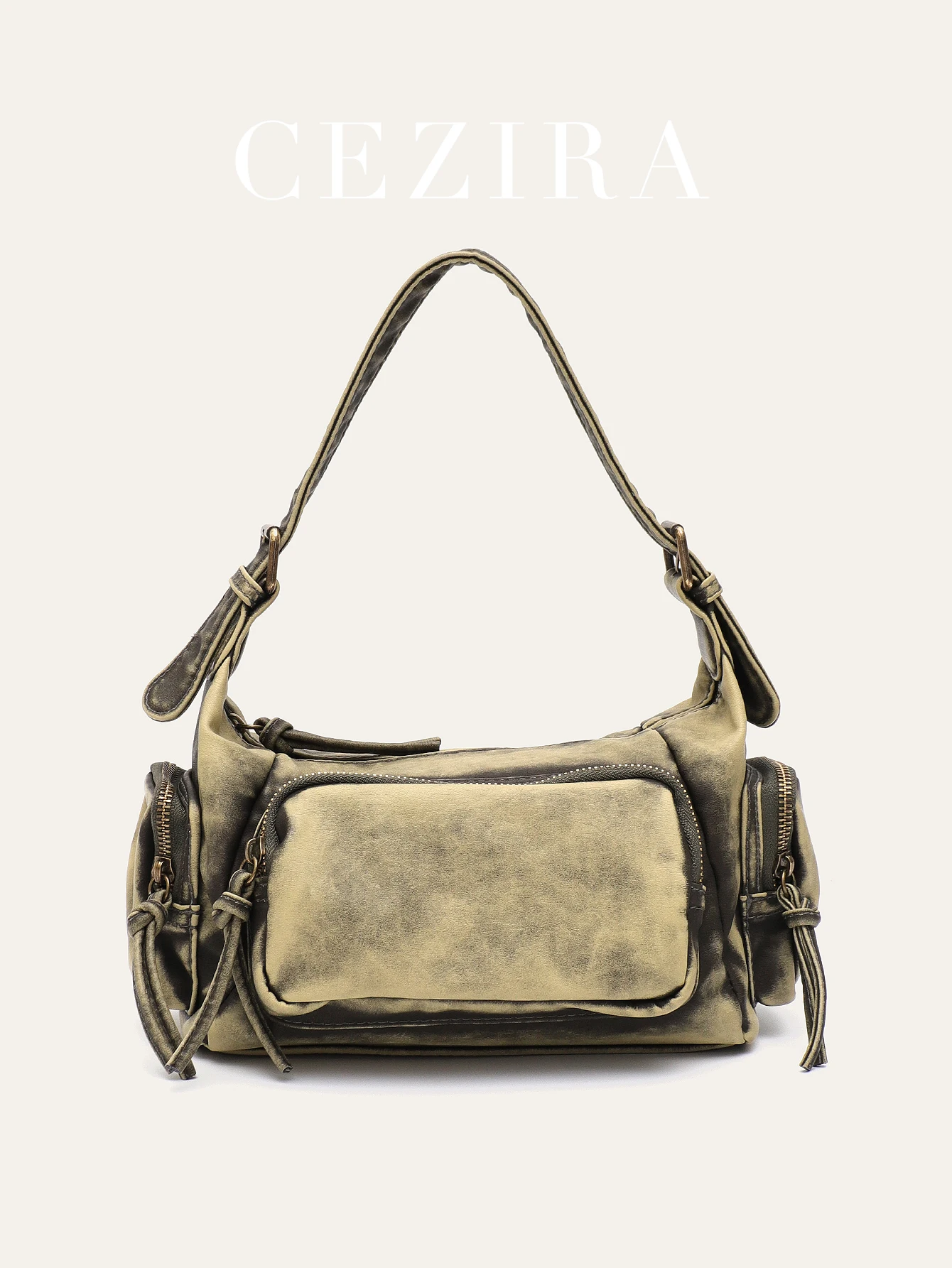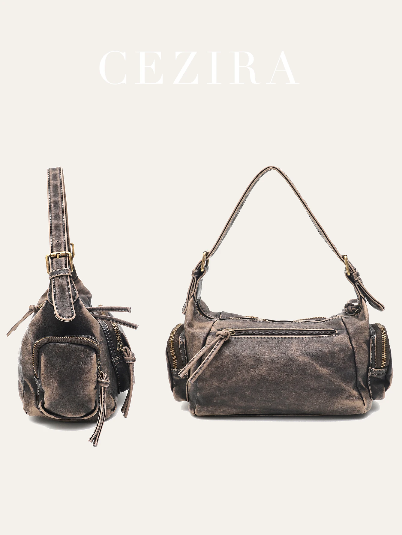 CEZIRA Women Retro Cool Preppy Street Style Shoulder Bag Washed PU Vegan Leather Vintage Functional Practical Cross body Handbag