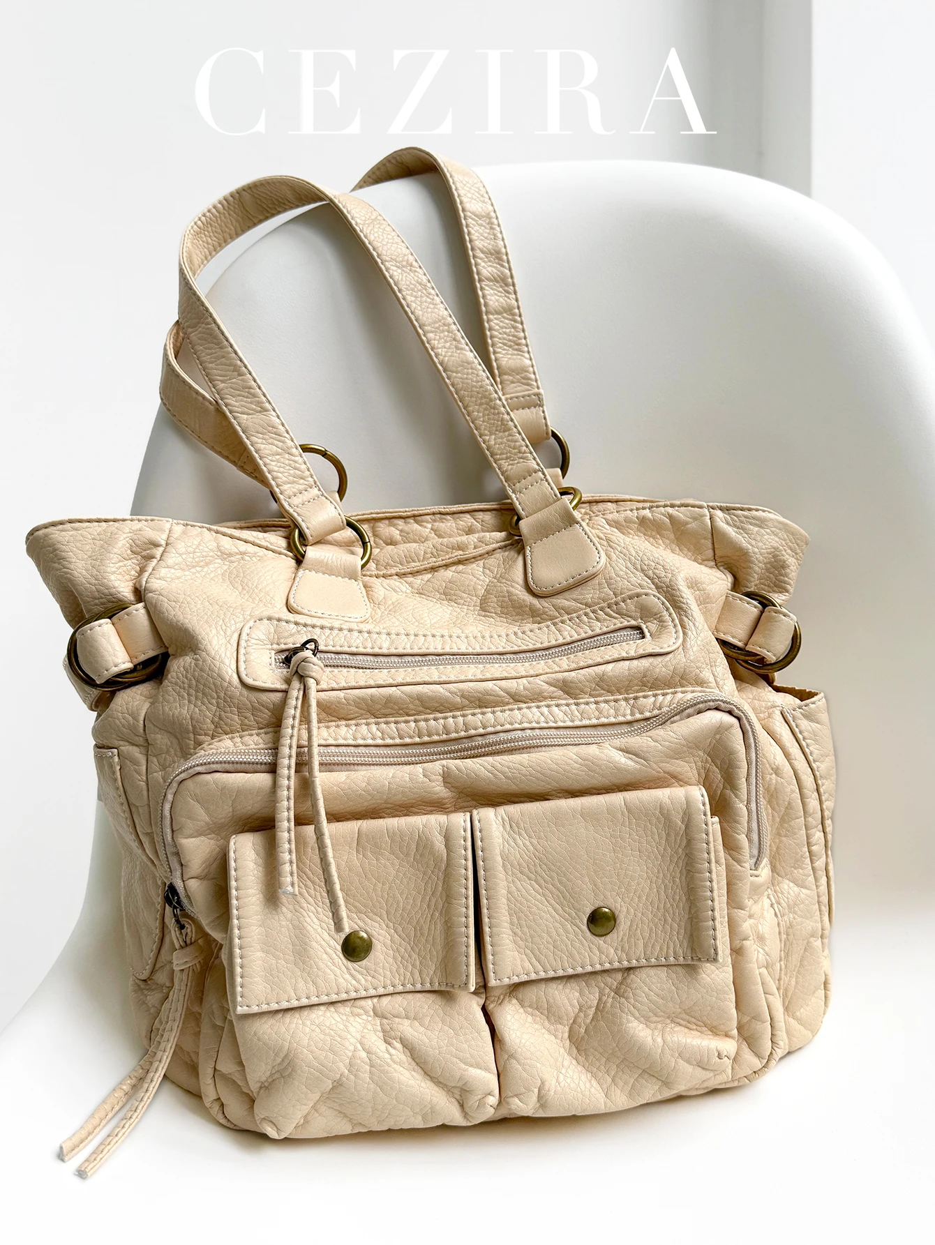 CEZIRA Women’s Fashion Y2K Style Unisex Retro Washed PU Leather Handbag Multi Pockets Zipper Closure Shoulder Bag Casual Tote