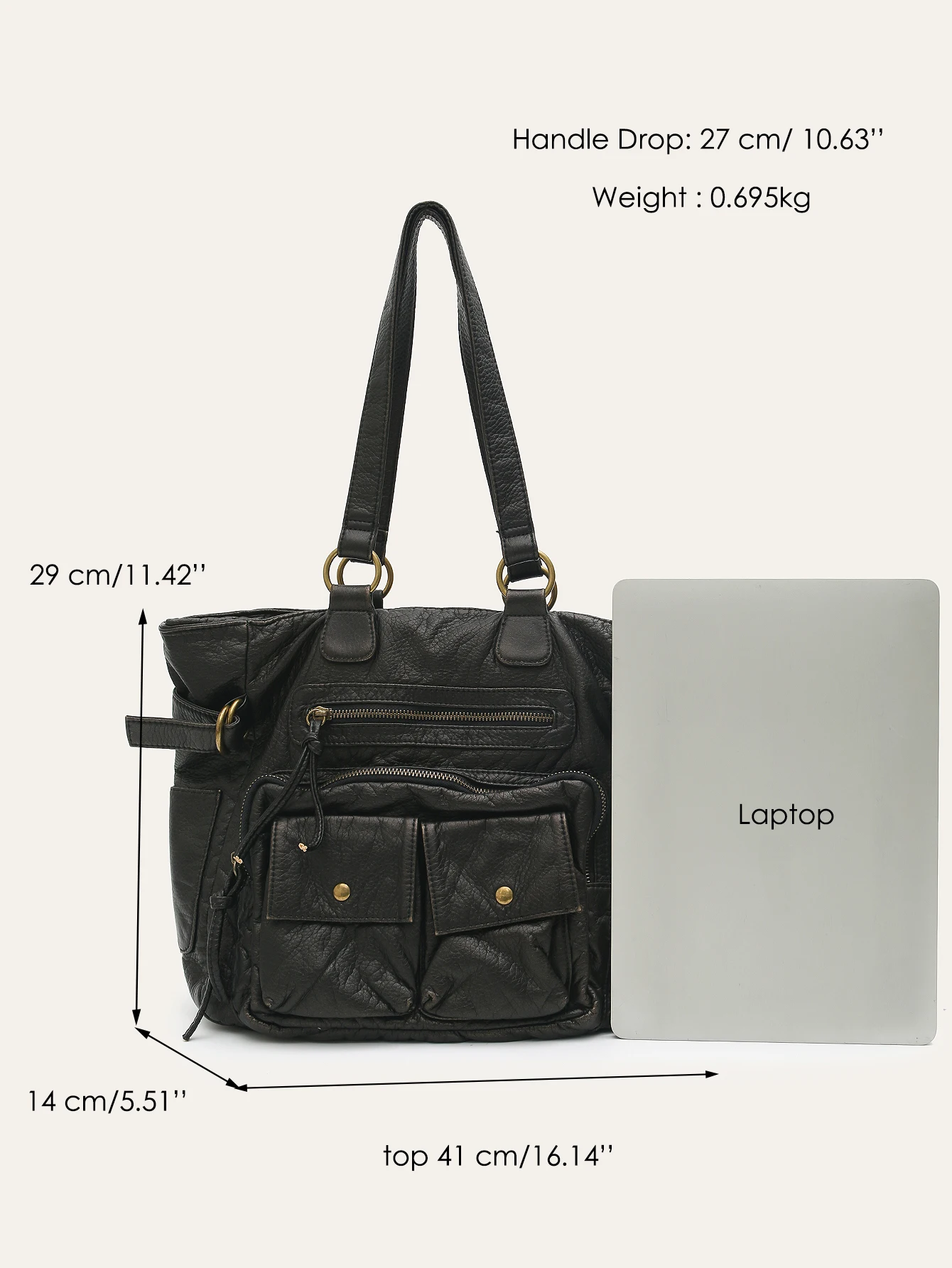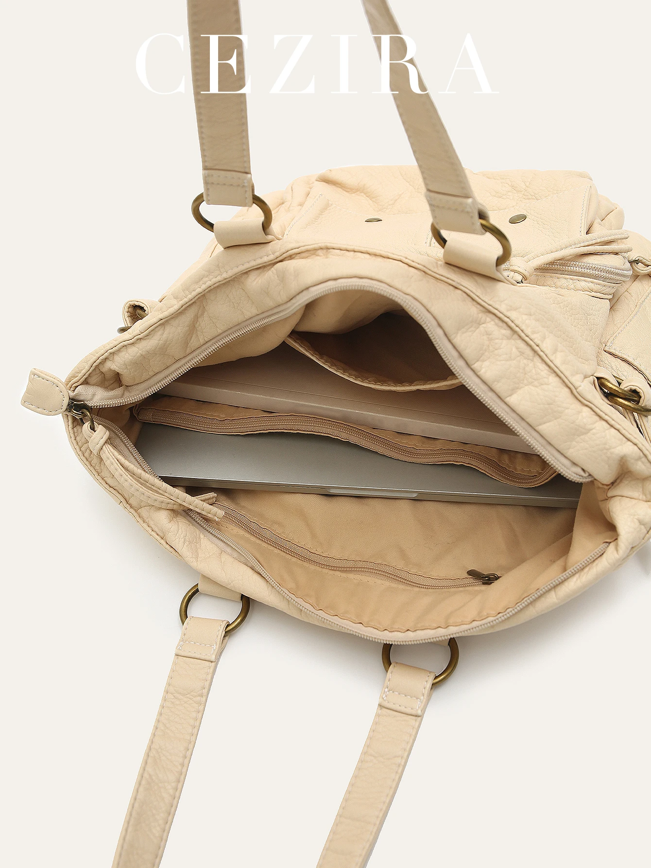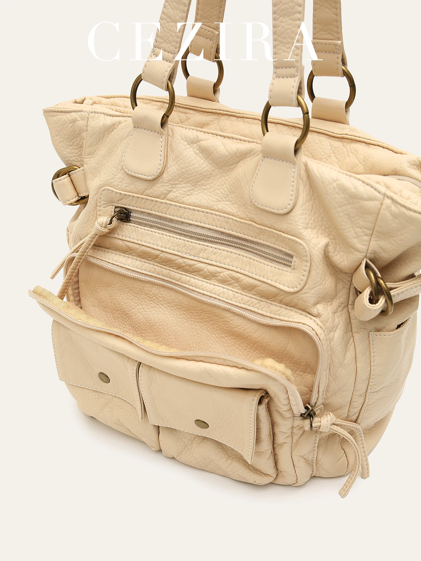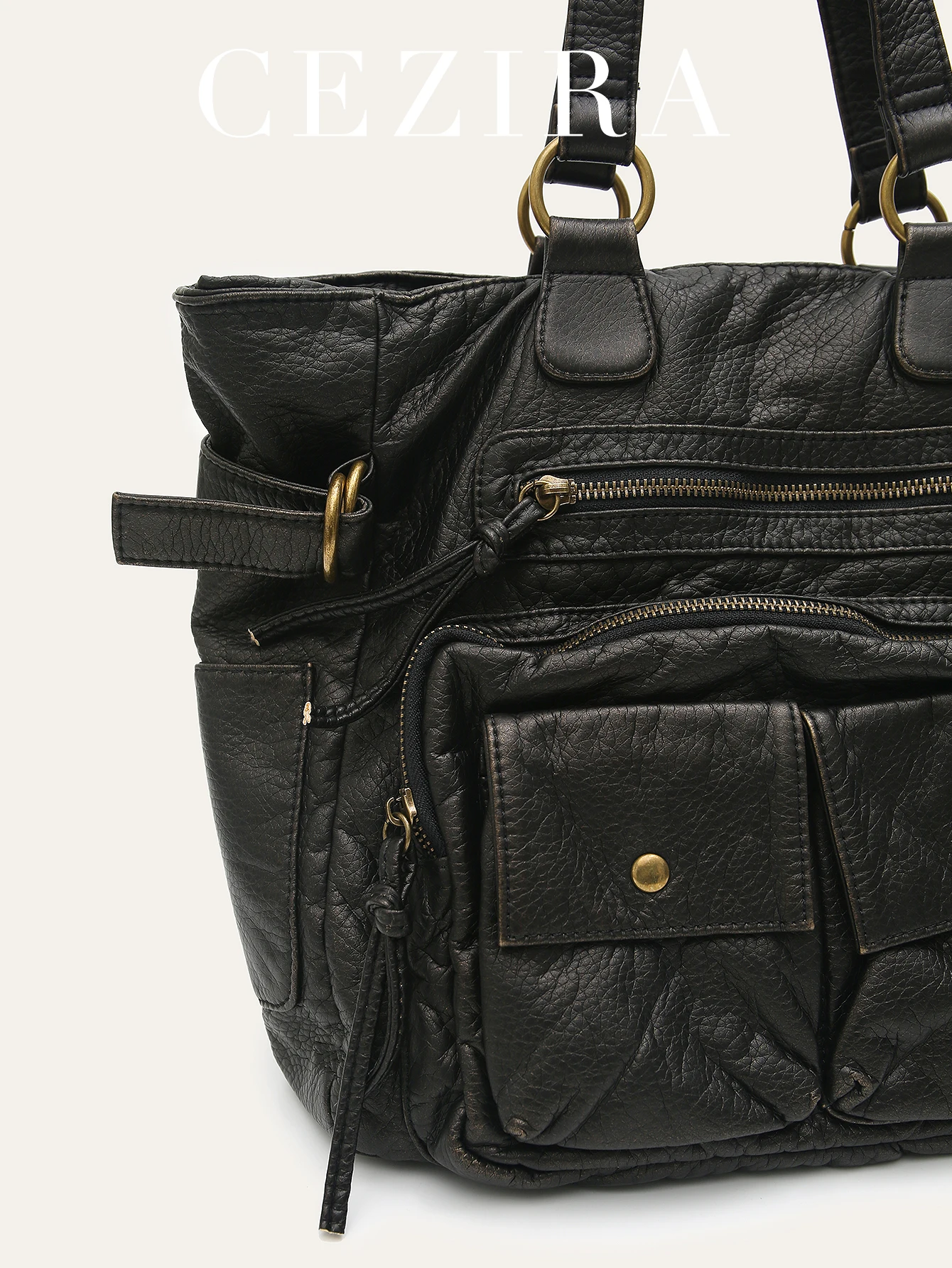 CEZIRA Women’s Fashion Y2K Style Unisex Retro Washed PU Leather Handbag Multi Pockets Zipper Closure Shoulder Bag Casual Tote