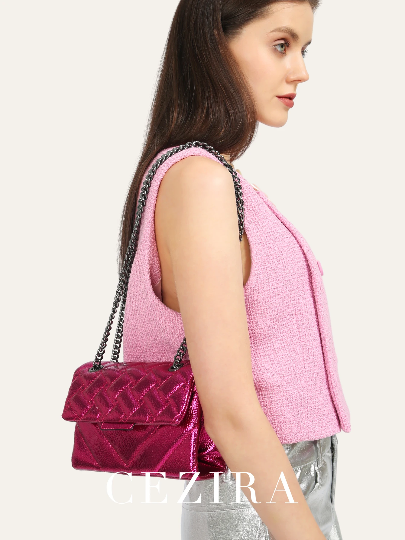 CEZIRA Women’s Luxury Brand Metallic PU Leather Handbag Fashion Quilted Flap Messenger Shoulder Bag Daily Casual Versatile Purse